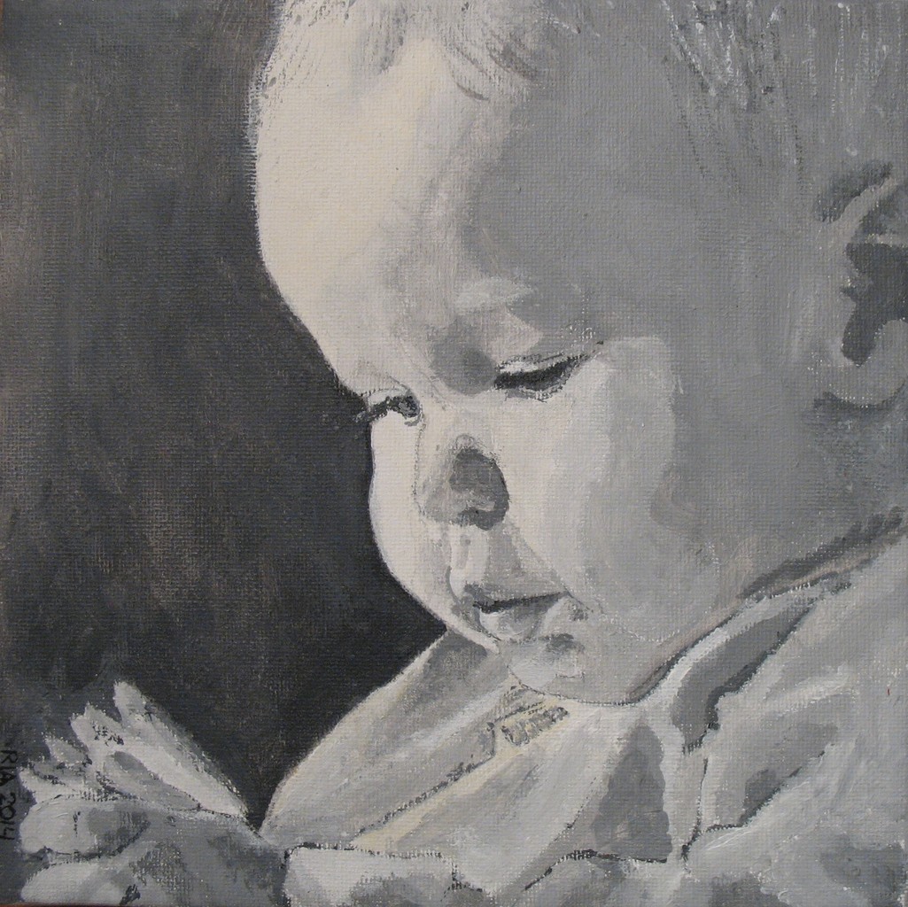 Noortje, 9 maanden jong. Geschilderd in grijstinten.