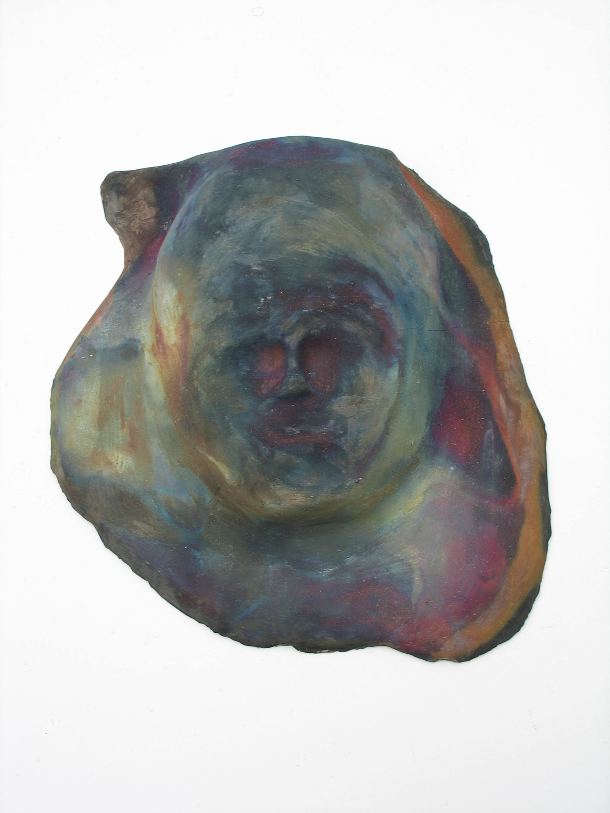 Raku gestookt masker met koper mat bewerkt. Hier wordt papier bij gebruikt, vandaar de kleureffecten