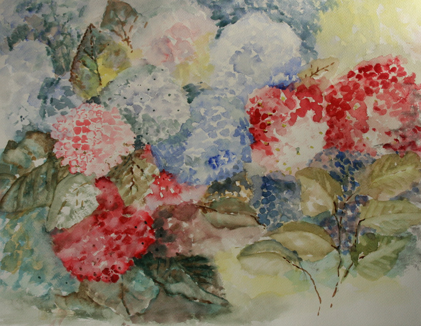hotensia`s als massa bijeen Van deze hortensia,s heb ik vele, klein en groot geschilderd Kleurig in aqarel