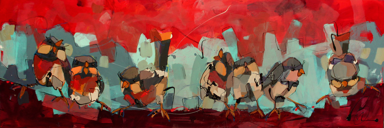 In heerlijke warme tinten is zijn de banen onder en boven opgezet. In contrasterend lichtblauw is een strook met vogels gecentreerd. Ze vertellen samen een verhaal en per stuk zijn het bijzondere karakters. aankoop door JS