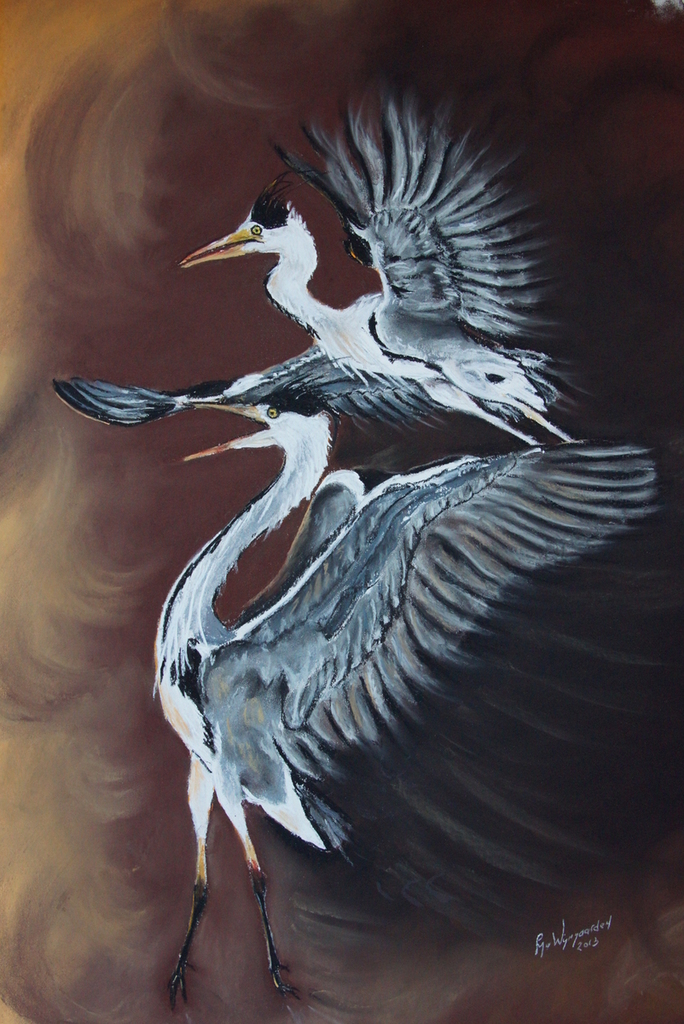 Reigers. Te koop. Incl. lijst techniek pastelkrijt