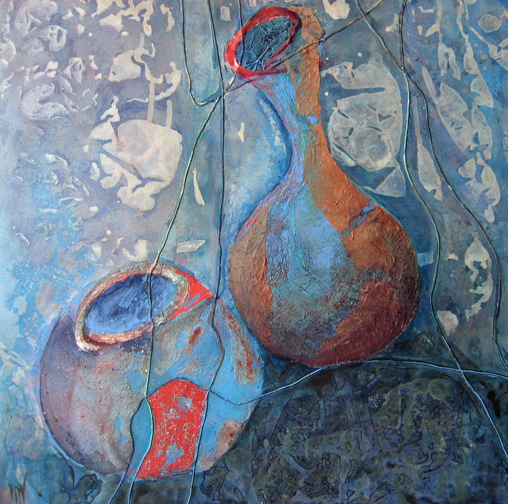 Mijn onderwerpen vind ik zowel in mijzelf als in mijn omgeving. Ik begin te werken vanuit de waarneming en laat deze dan langzamerhand steeds meer los.