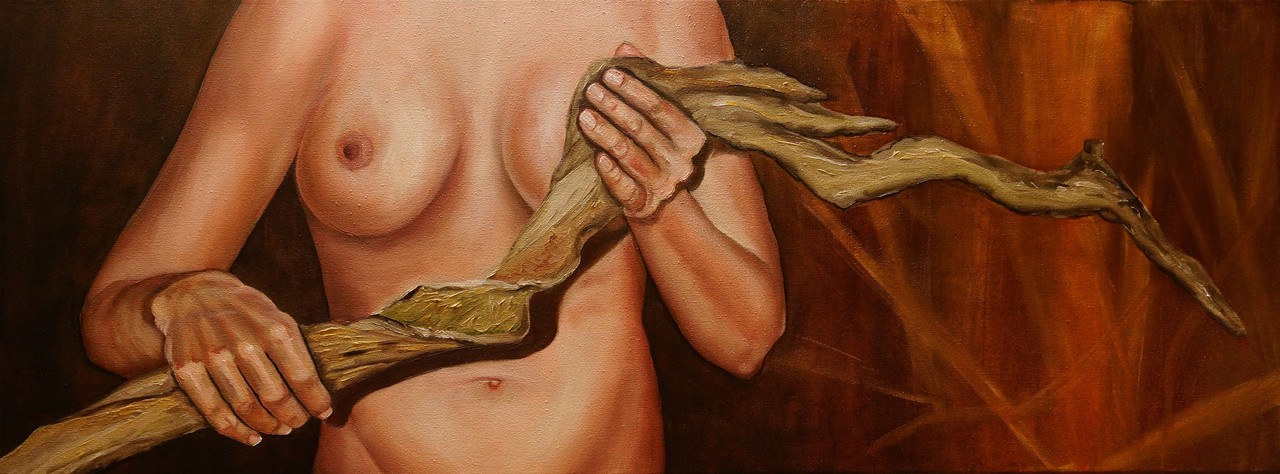 Naakte Vrouw Olieverf Natuur Donker Roodbruin Handen