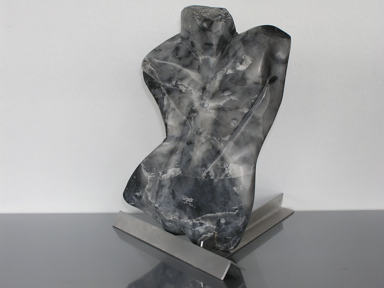 Dans in speksteen op aluminium sokkel.