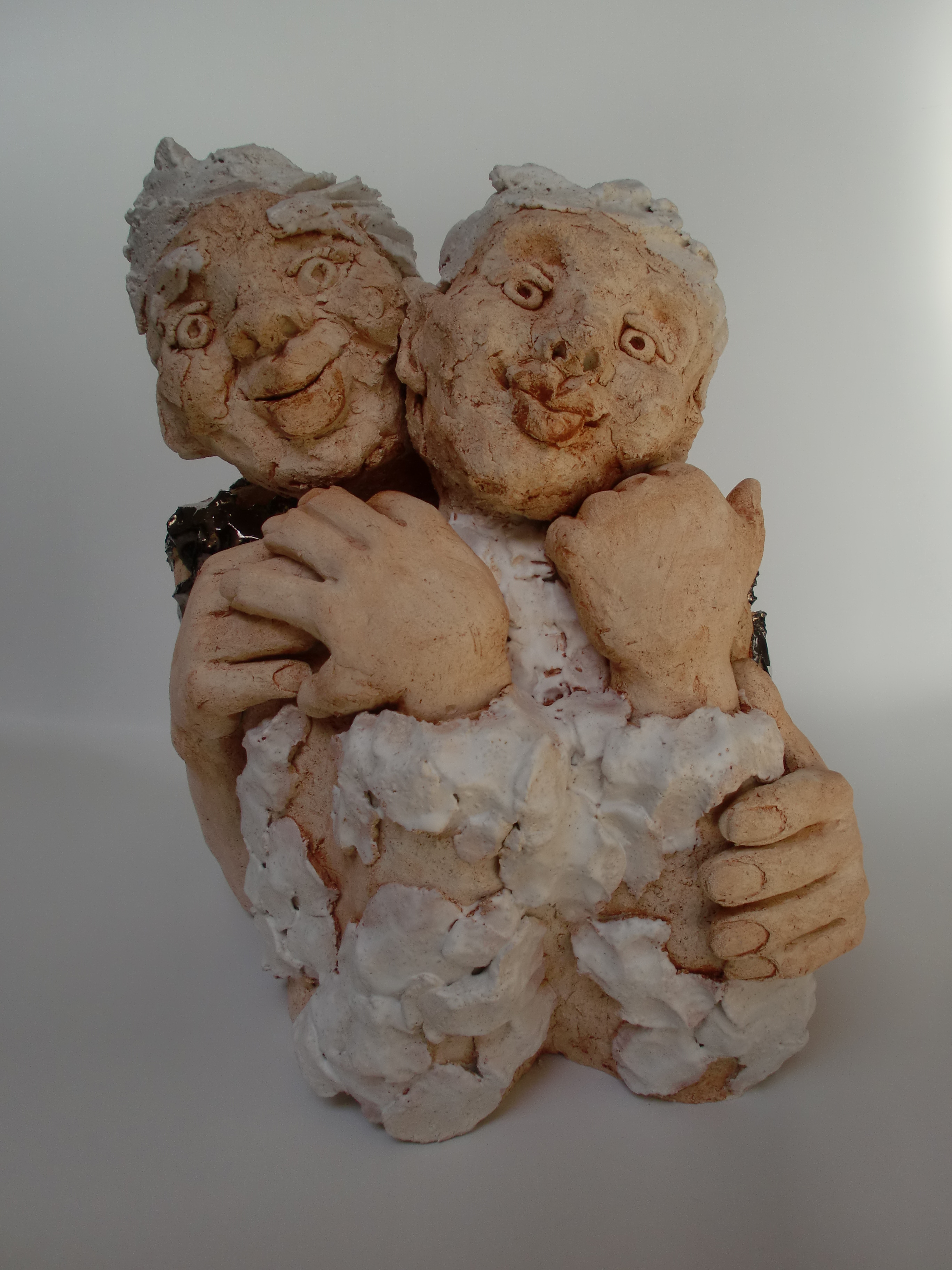 Man en vrouw, geborgenheid, in mat glazuur, gedeeltelijk afgewerkt met glanzende glazuur in metallic look.