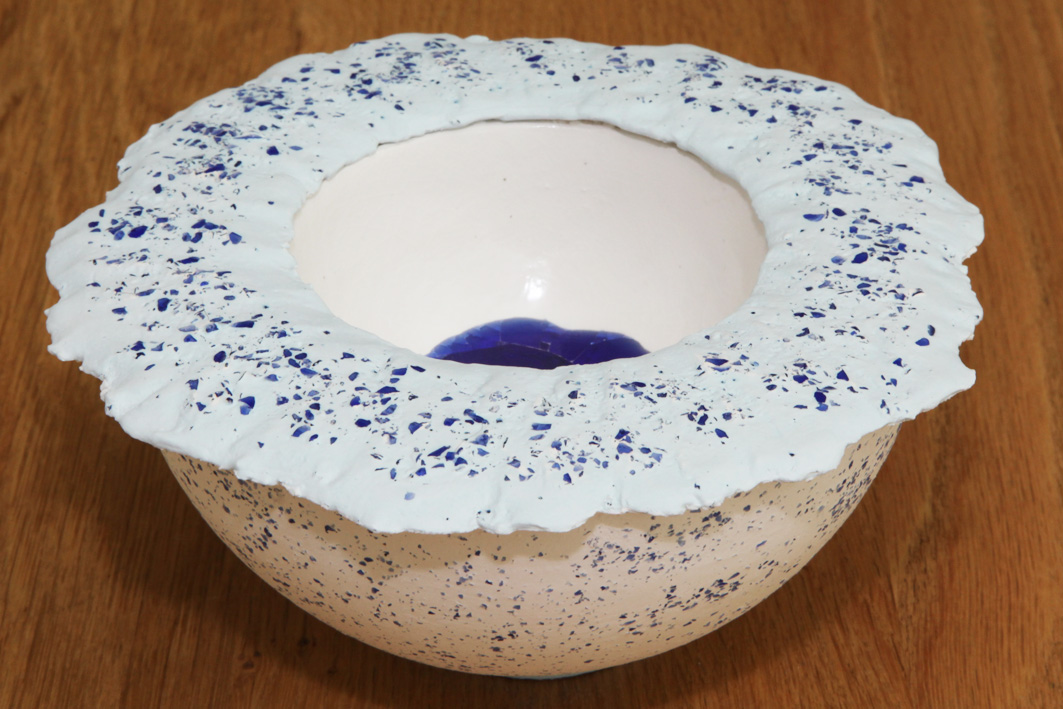 Deze porseleinen schaal bestaat uit een grote en een kleine schaal. De grote schaal is afgewerkt met blauwe glaskorrels en in de kleine schaal zit gesmolten glas. Bovenop de 2 schalen ligt een krans van blauwe engobe met blauwe glaskorrels