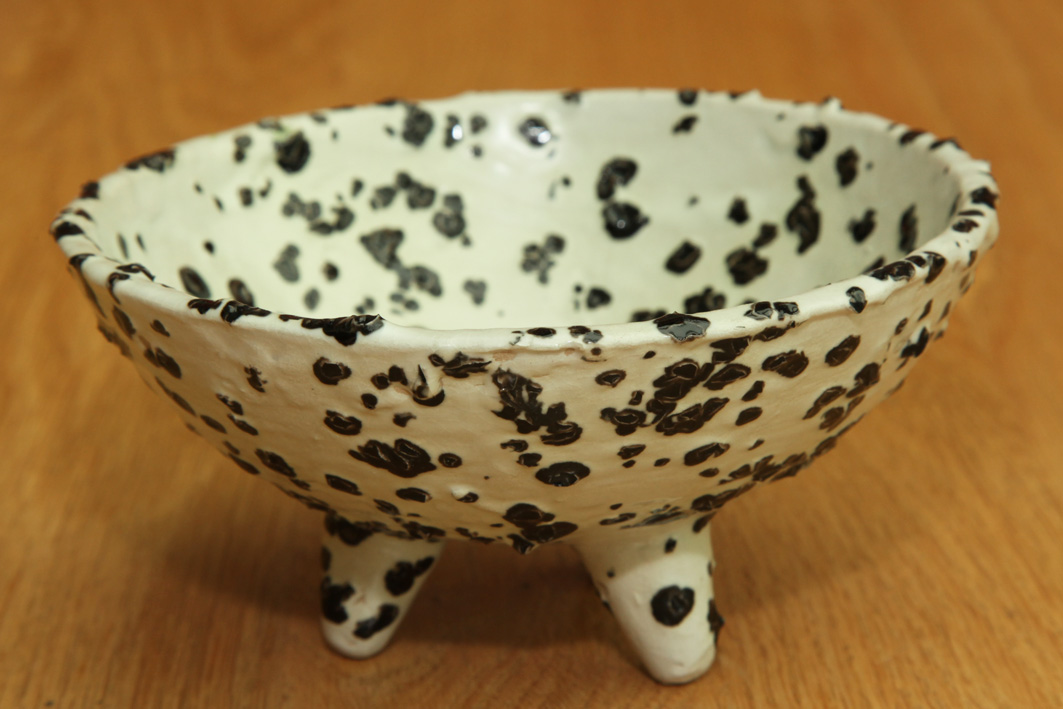 Deze grijsporseleinen schaal op pootjes is afgewerkt met zwarte glaskorrels