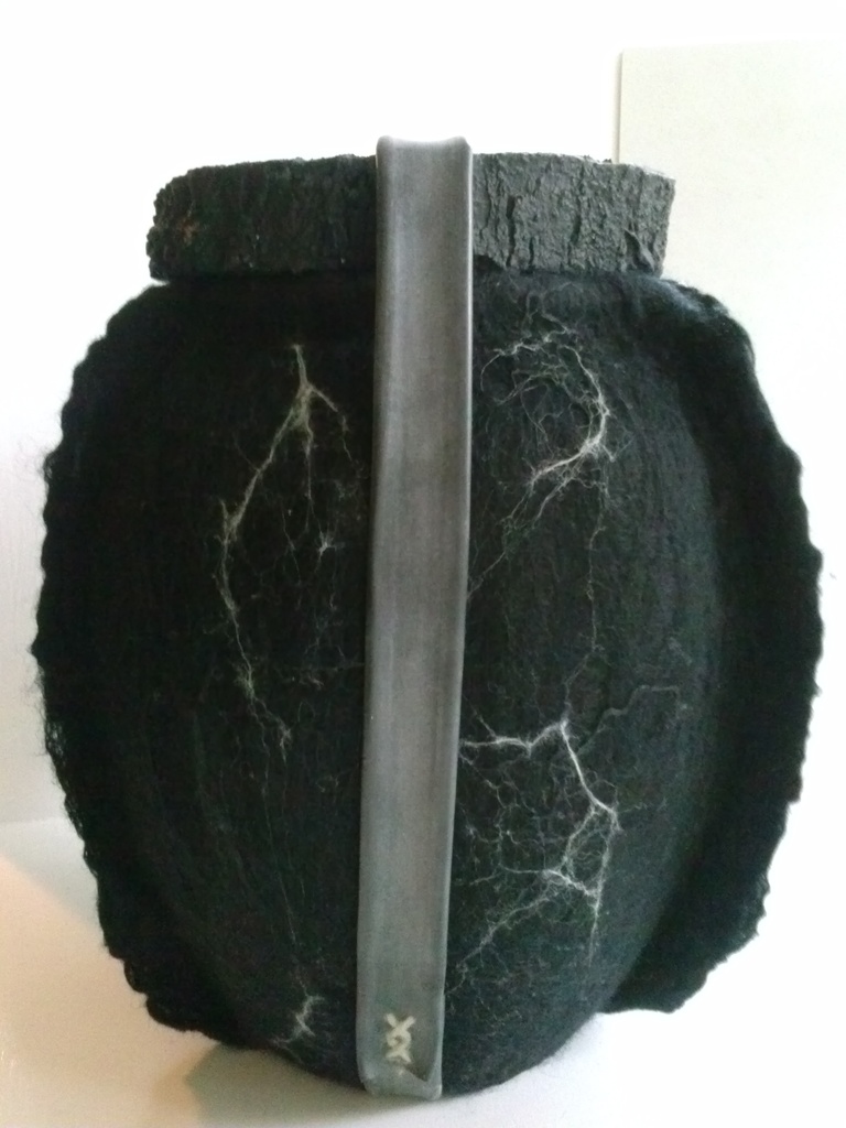 Urn van vilt, materiaal keramiek, merino wol, zijde, hout en rubber.