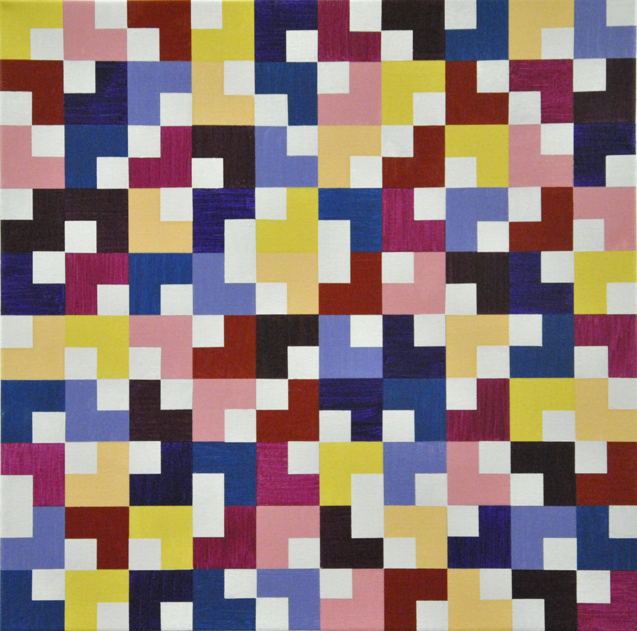 Thema: Chaos (Geometrische Chaos) Mijn kunst is beïnvloedt door de moderne wiskundige en wetenschappelijke benadering van het begrip complexe orde van de natuur. Met name heb ik me verdiept in de Chaos theorie en de fractal geometrie. Ik ben geen wiskundige, en ik gebruik geen wiskundige formules. De ideeën van de Chaos theorie en fractal geometrie leiden tot de ontwikkeling van de composities in mijn werk. Ik gebruik driehoeken,vierkanten en cirkels in mijn schilderijen, maar in mijn huidige serie, geoChao richt ik me alleen op de vierkanten en de verhoudingen tussen de vierkanten. Ik ontwikkel mijn composities door kleine vierkantjes op grote te zetten of grote op kleine te zetten. Het gaat om de onderlinge verhoudingen tussen de vierkanten. Ik laat de methode die ik kies de compositi