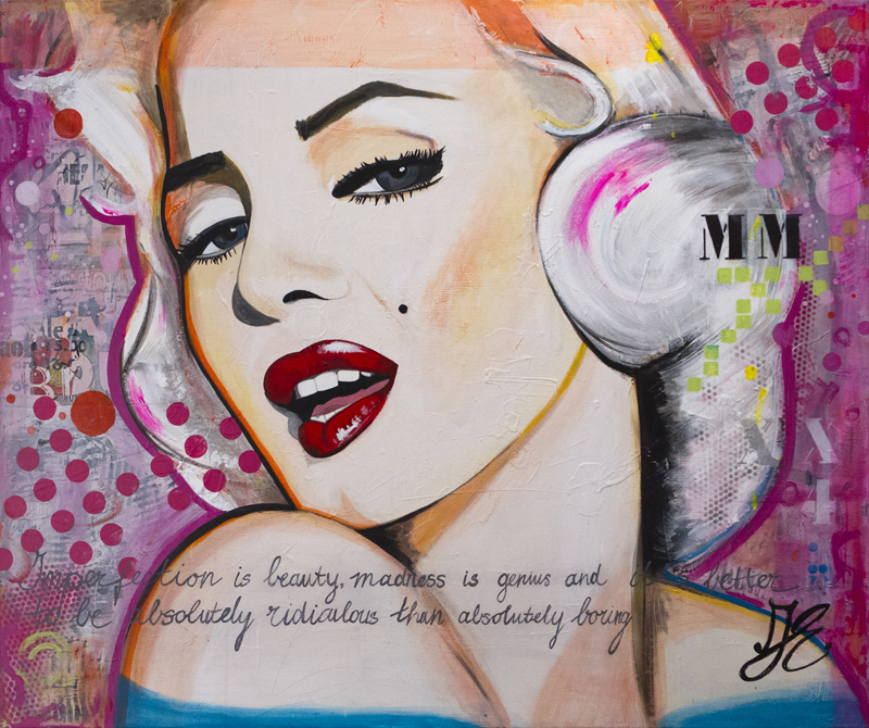 Marilyn Monroe Mixed Media Pop Art Kleur Roze Rood Mond Icoon Beroemd Sexsymbool Schilderij Hip Modern Kunst