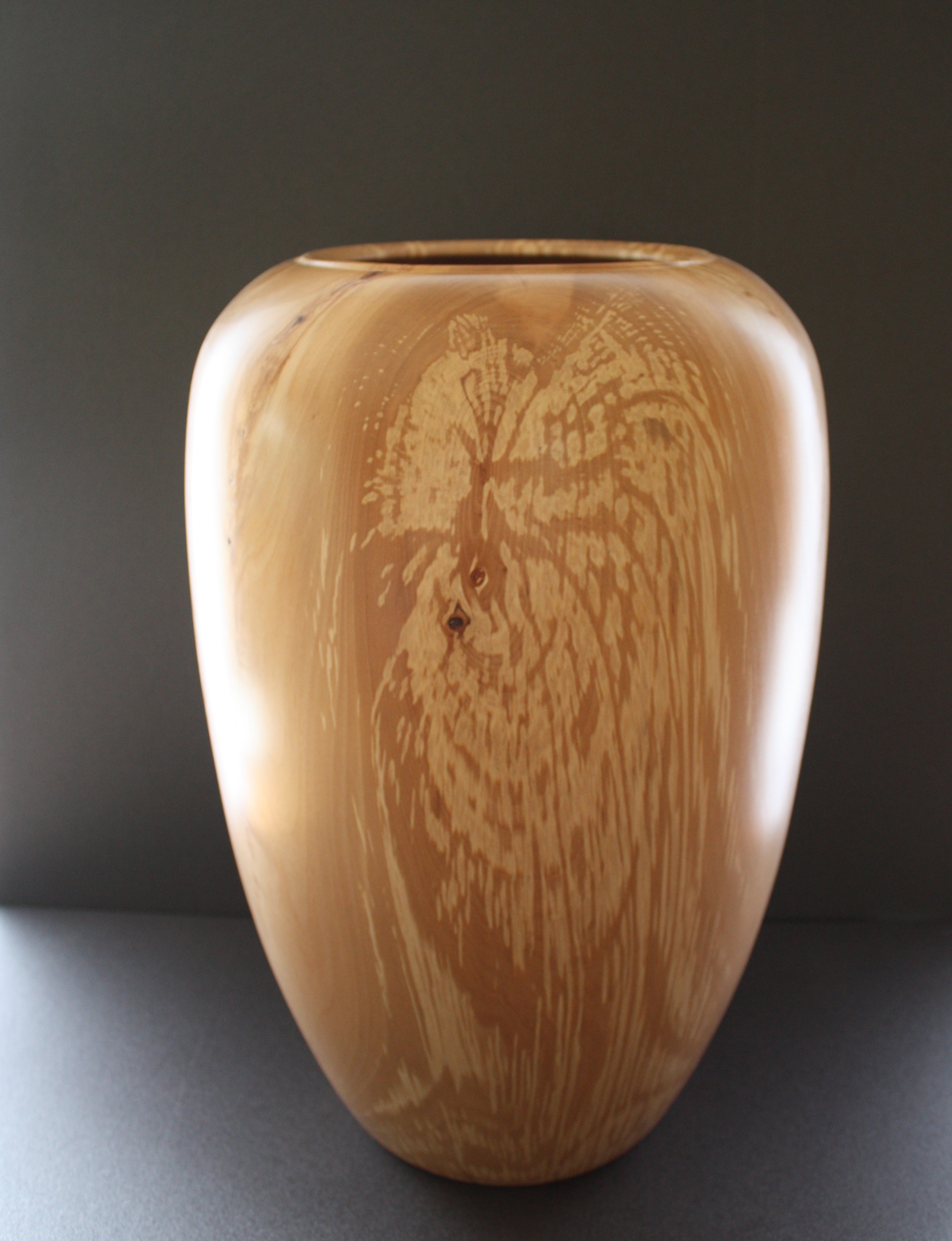 Vaas van groot formaat met een prachtige tekening in het hout, gemaakt van zilverlinde