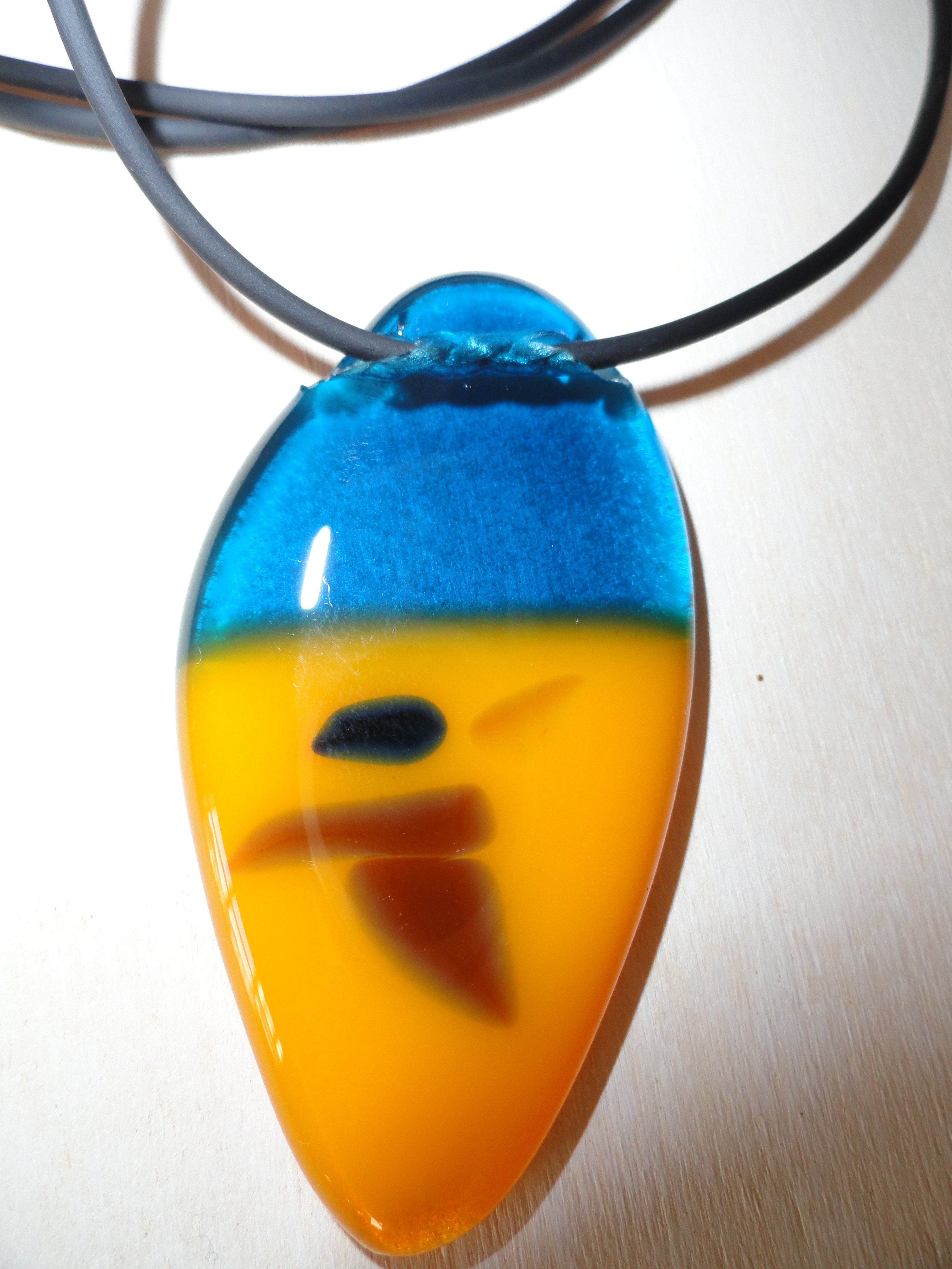 Ovale glassieraad van blauw-okker en zwart glas aan elkaar gesmolten door fullfusing. Glassieraad is bevestigd aan een rubberen koord met sluiting. Lengte van de ketting is 40 cm.
