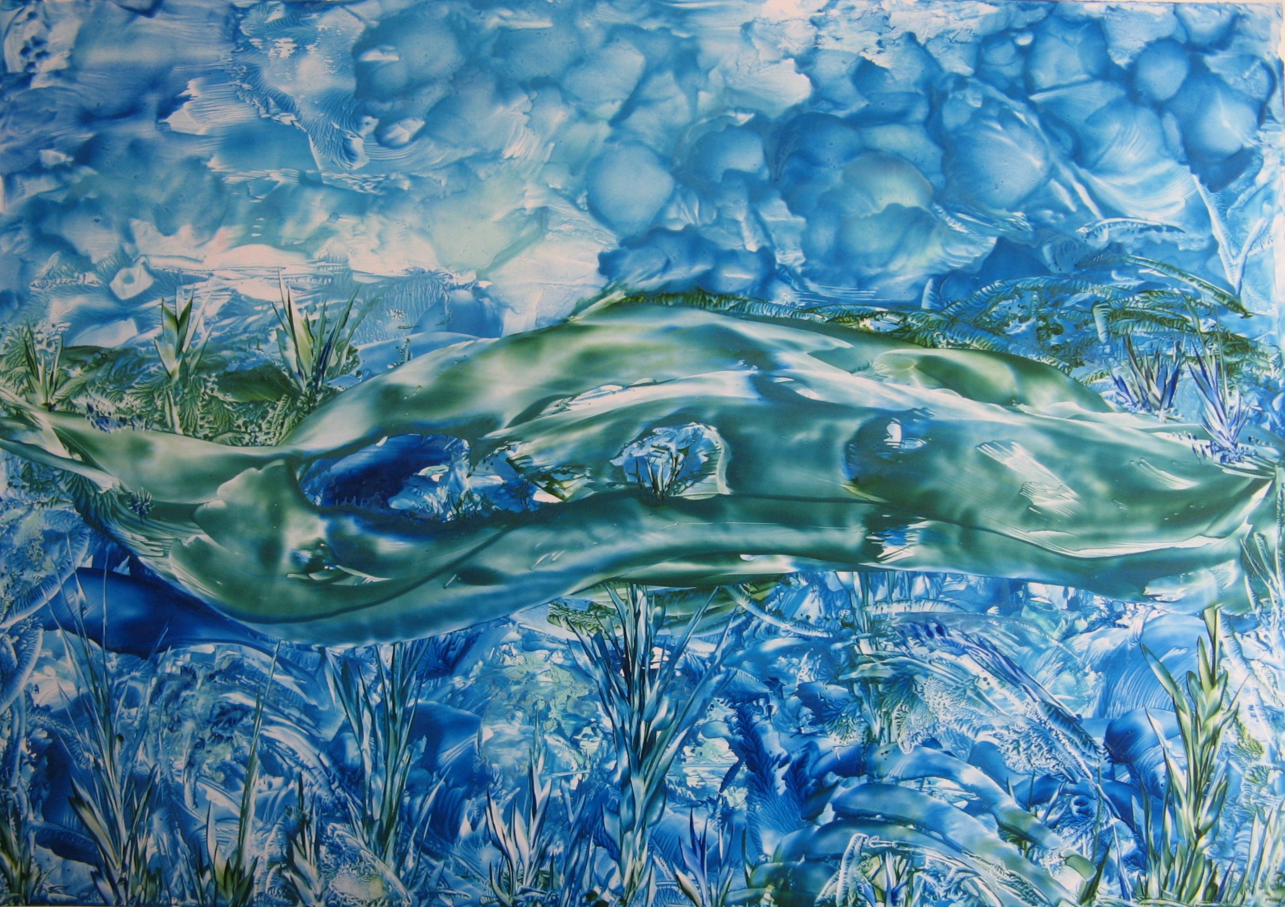 Blauw Wolken Groen Water Lucht Gras Encaustic Bijenwas Gekleurde
