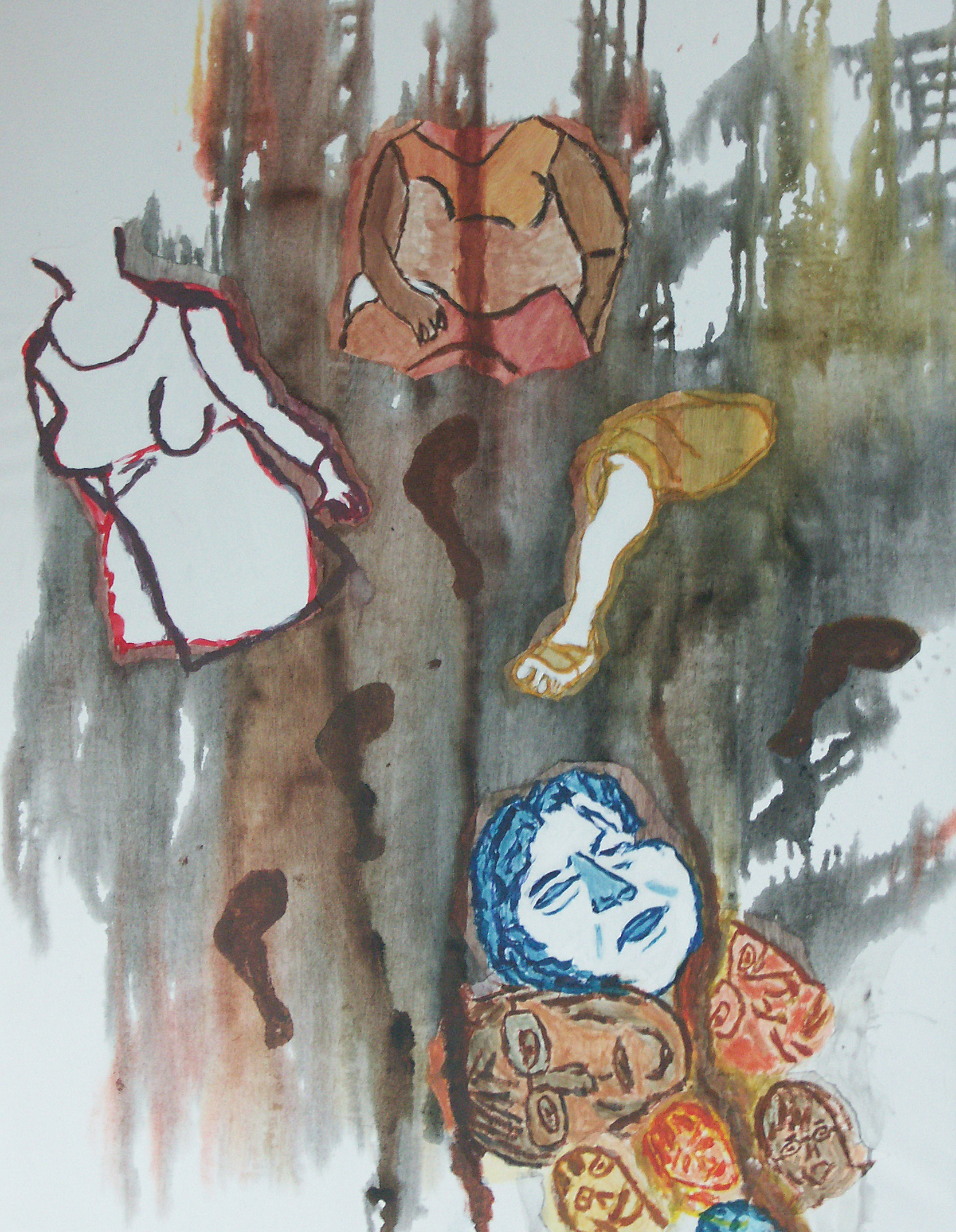 In 2008 ga ik voor de eerste keer naar Leo Musch in Beauregard (Frankrijk). Ik lees op dat moment het boek Hier en nu van Eckhart Tolle en raak daardoor geinspireerd voor mijn eindwerk. In het schiderij verwerk ik de portretten van medecursisten. De dikkere vrouwfiguur staat voor rust en balans. Het been schopt de hoofden, die staan voor gedachten, in het ravijn. Gebruikte materialen: ecoline, oostindische inkt, papier en acrylverf.