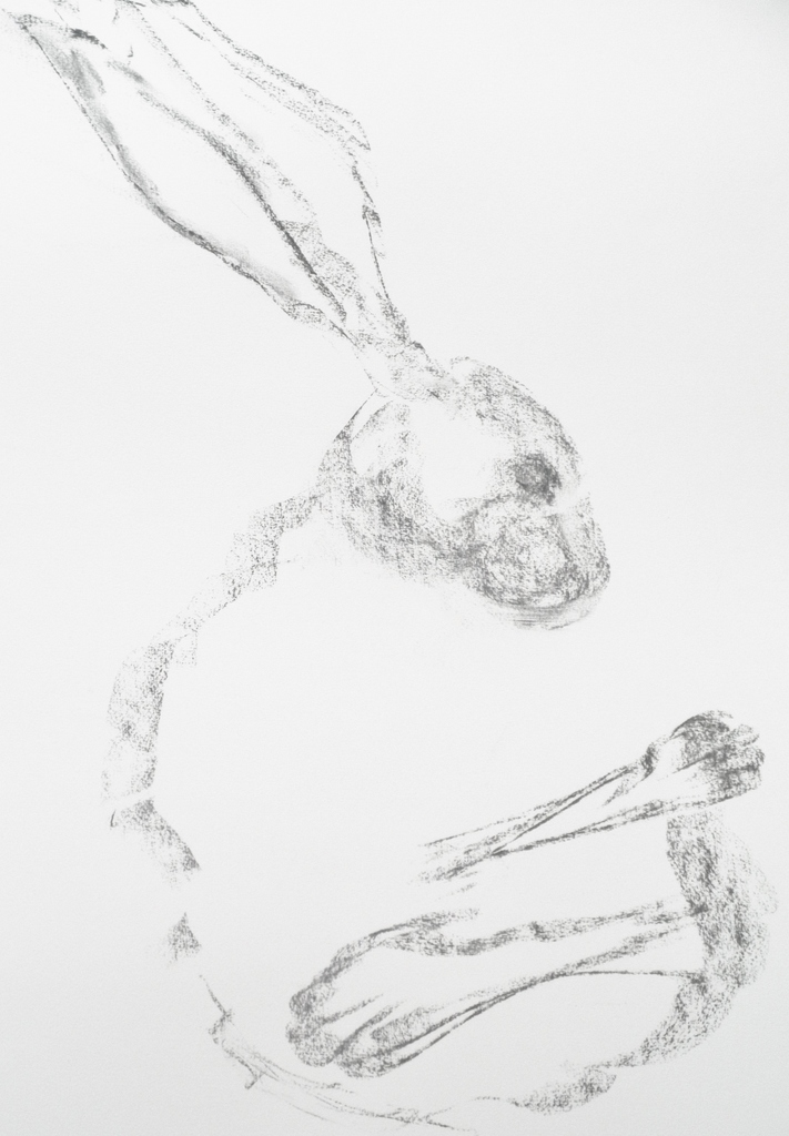 Met haas en ziel 50x 70 cm Houtskool op papier.