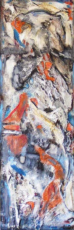 Iets in de buitenwereld intrigeert mij en door deze impressie uit te werken wordt zij blijvend deel van mijn binnenwereld. Laag na laag bouw ik aan de uiteindelijke vorm. Tijdens het werken komt er een stroom van associaties op gang. Het is een constant zoeken naar evenwicht tussen de verf en de andere materialen.
