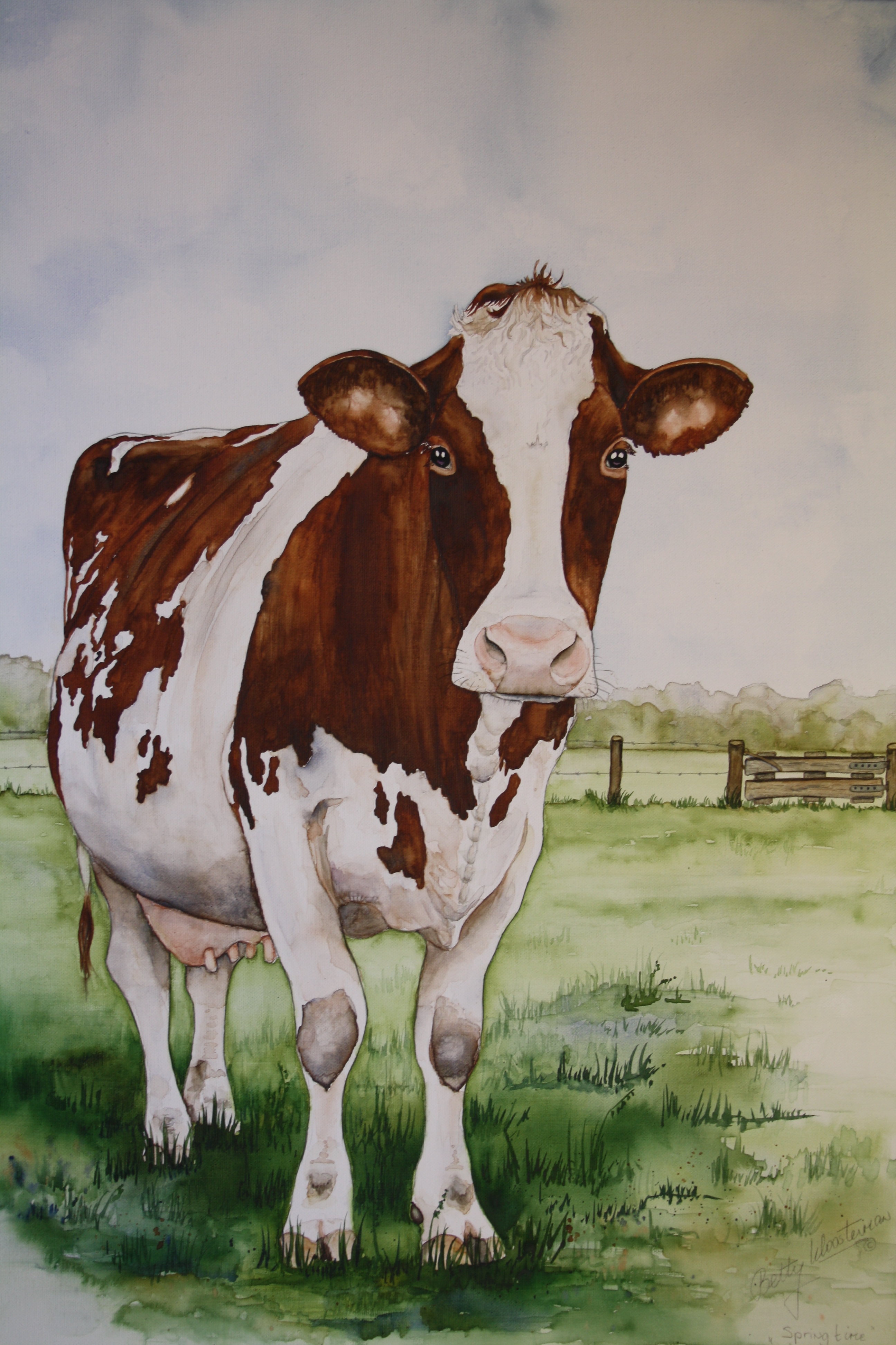 Aquarel van een roodbonte koe net buiten, in de lente. Aquarel door speciale techniek op doek geschilderd.