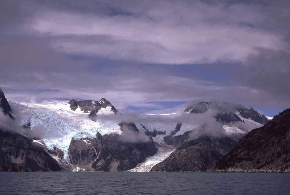 Gletsjers op de bergen die grenzen aan de Kenai fjords (Alaska). Deze gletsjers reiken tot aan het water en af en toe komt met veel geraas een blok ijs het water in gestort.