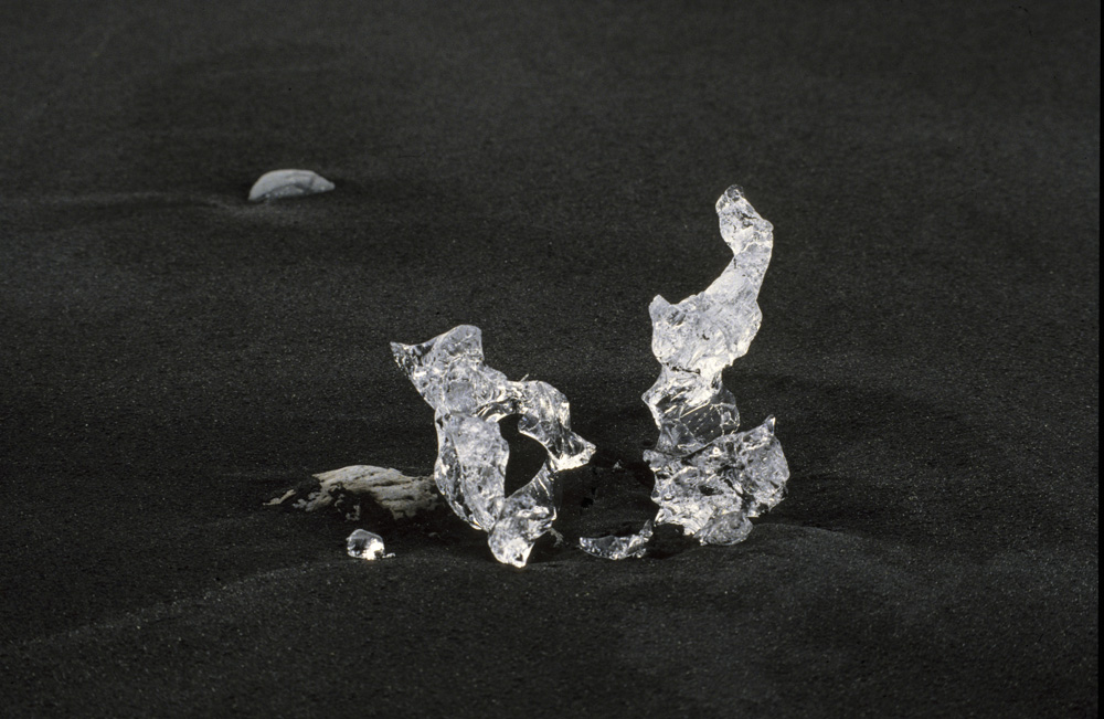 Twee blokjes ijs op het zwarte strand nabij jokullsarlon (IJsland). De één lijkt (met enige fantasie) op een kabouter en de ander op een hond of wolf