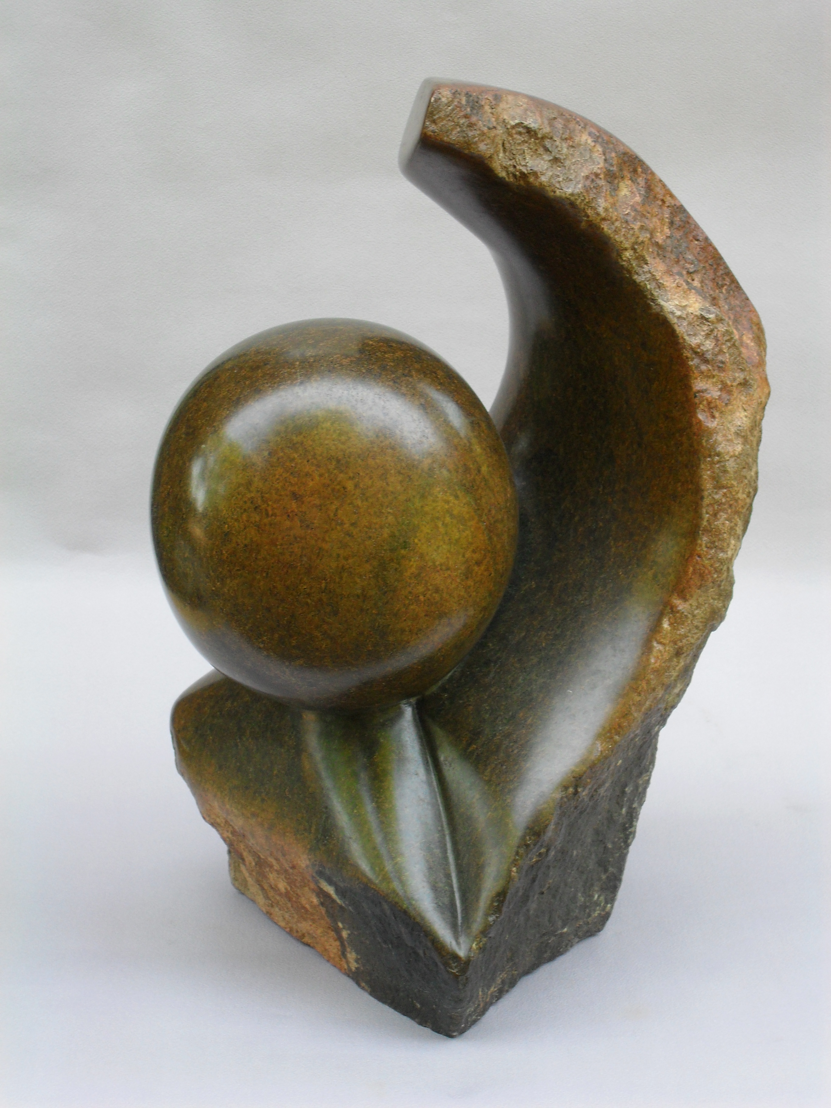 Geborgen is gemaakt van serpentijn. Mooi zijn de verschillende kleuren in dit beeld.
