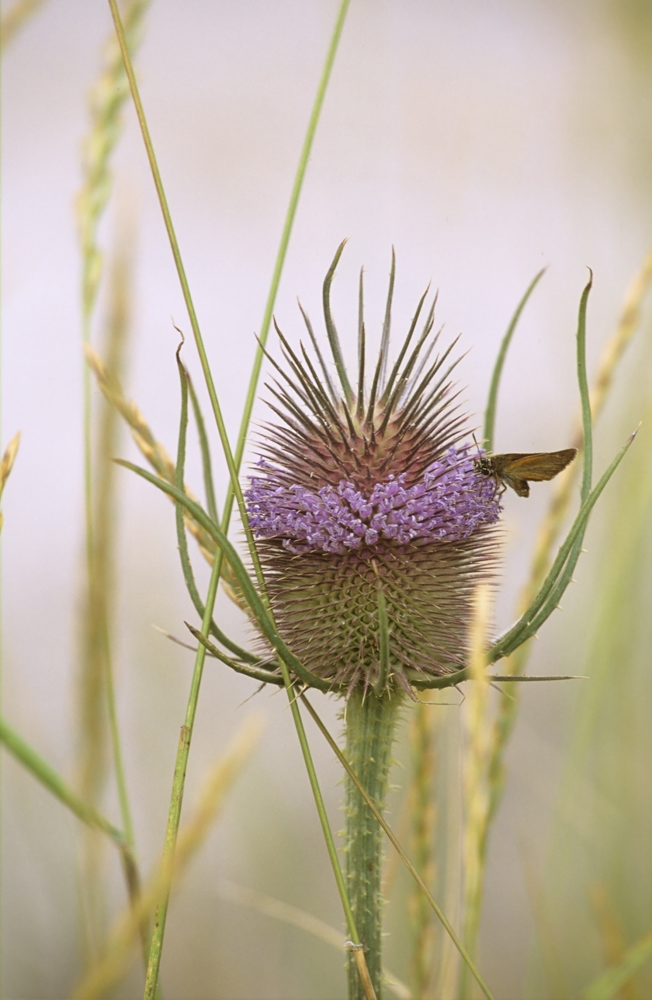Een kaardebol (Dipsacus fullonum of sylvestris) waar een vlindertje op neergestreken is