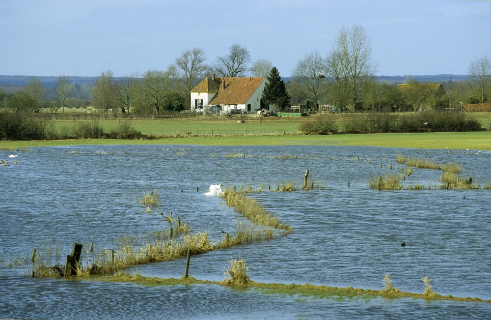 Een knobbelzwaan die in het Maartse zonnetje uit gaat zwemmen in een ondergelopen uiterwaard.