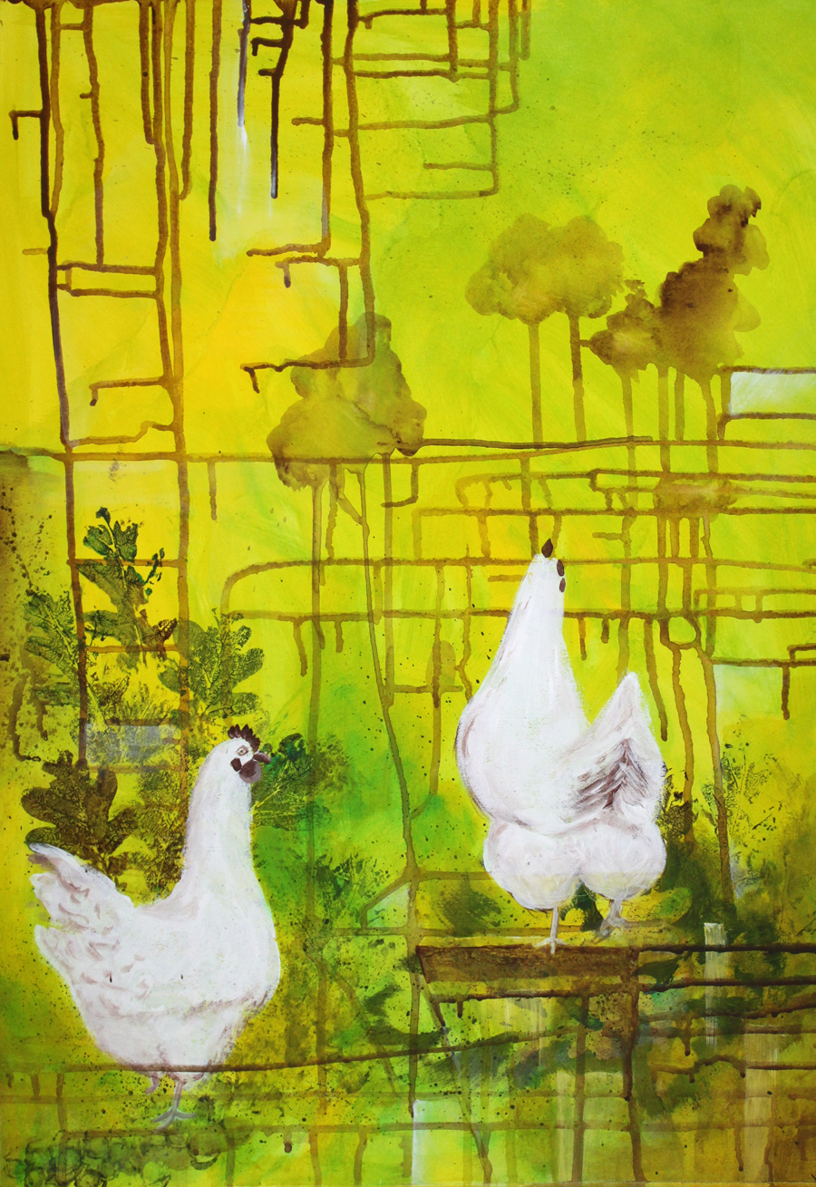 Wit Geel Acryl Yellow Groen Twee Papier Realistisch Two Green Verhalend White Paper Kippen Vrijheid Freedom Felgekleurd Bright Acrylics Chicks
