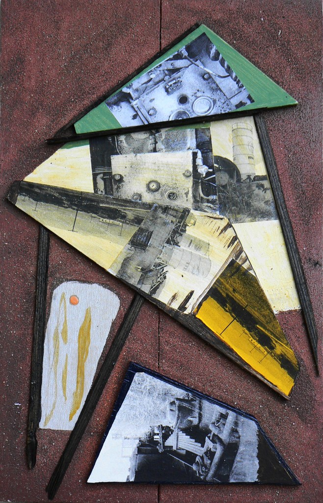 Bekijk het! als één manier niet werkt / dan maar omgekeerd. // En stel je dit dan voor / in Tate Modern. collage-relief: board, hout, eigen foto's, verf, zand.