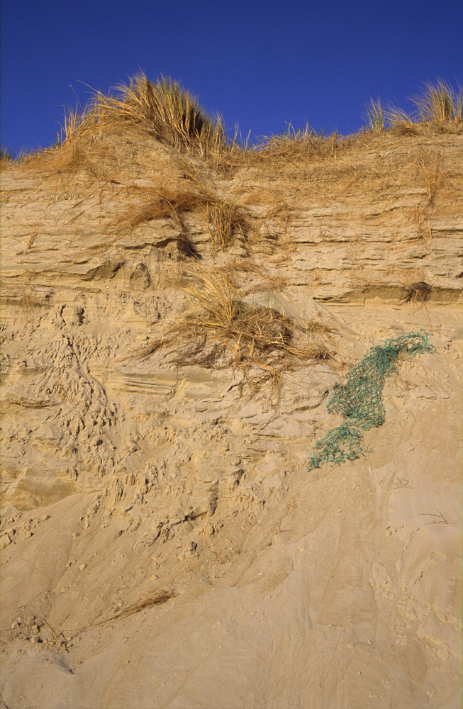 Een afgekalfde duin waaruit een achtergelaten visnet uit te voorschijn komt.