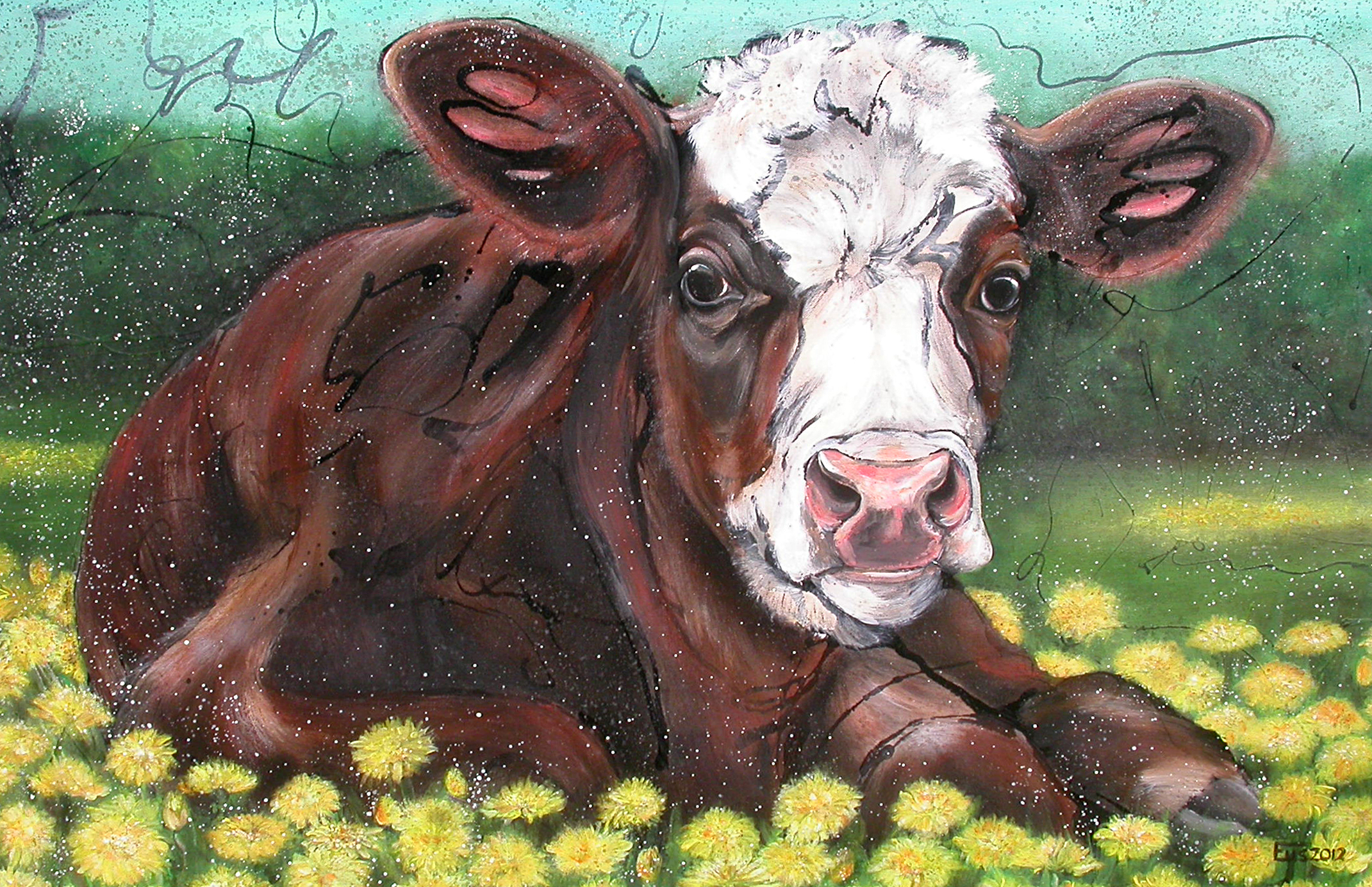 Geel Yellow Bloemen Dier Koe Cow Flowers Zomer Kalf Calf Summer Animal Erlinde Ufkes Stephanus Hereford Cowpaintings Koeienschilderijen