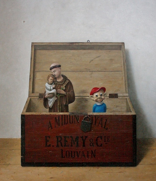 Speelgoed Oil In Painting Old The Box On Eye Toys Panel Fine Antique Trick Heiligenbeeldje Playmate