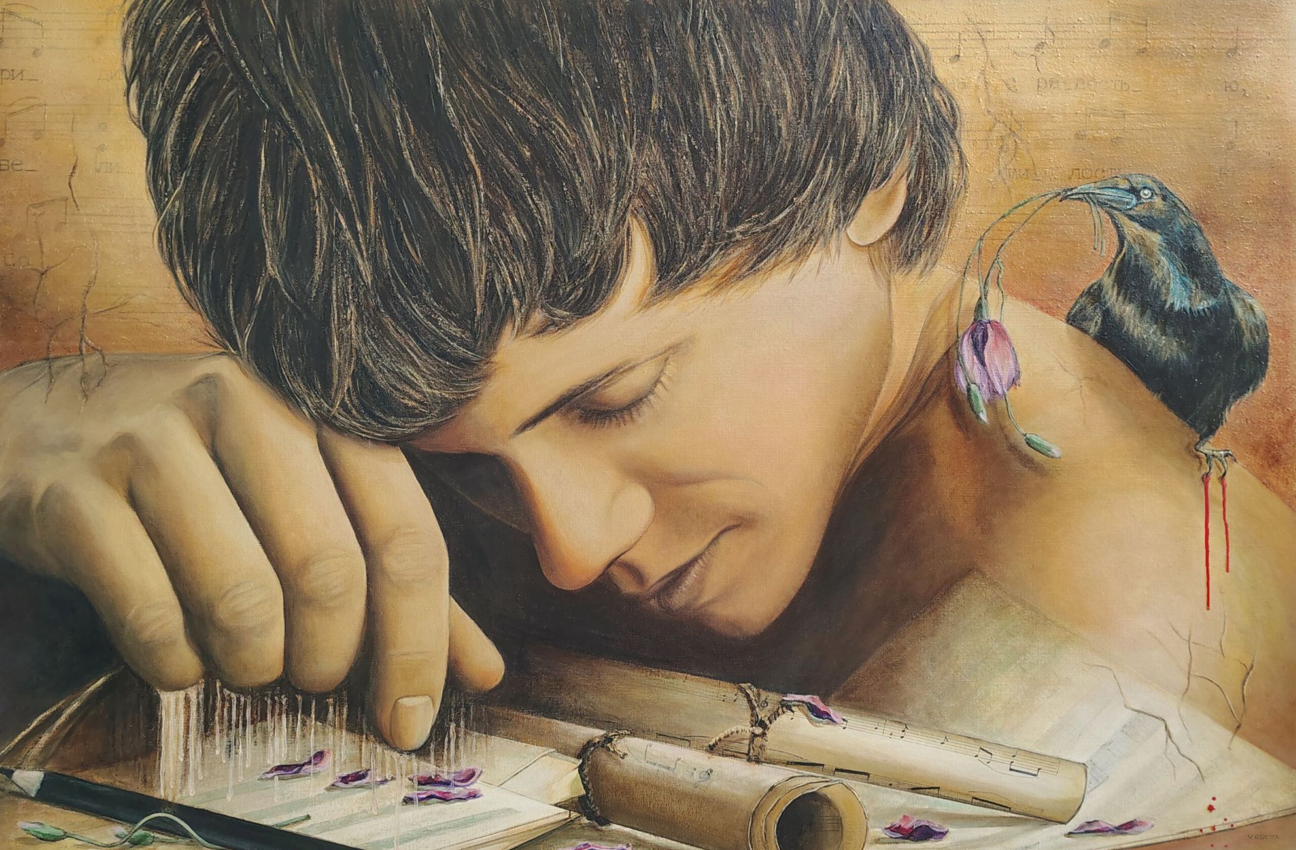 Surreëel Acryl Man Bruin Figuur Noten Song Mixed Media