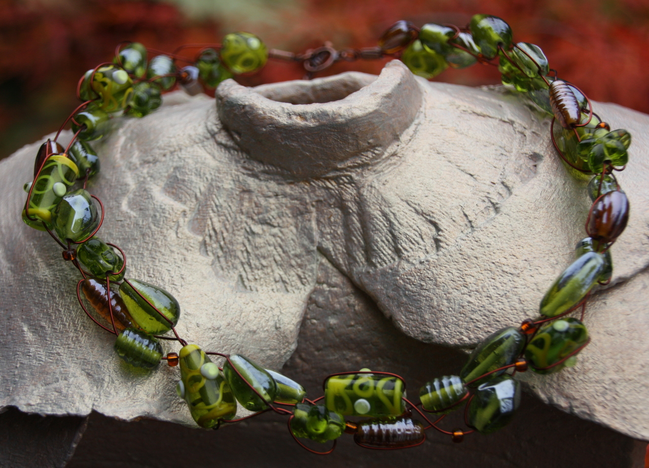 Gedraaide ketting met groene/bruine glaskralen