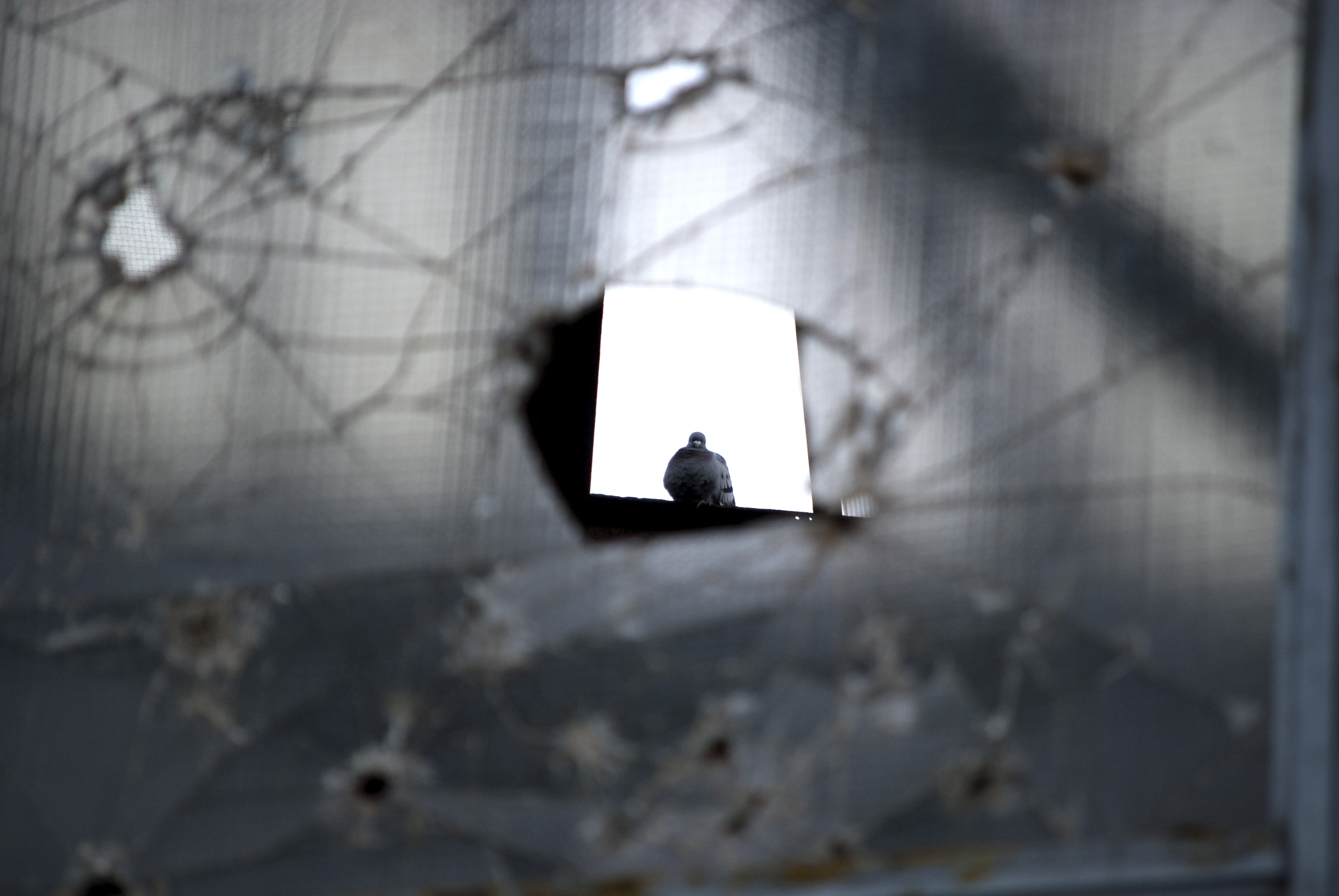 Wilde een foto maken van het kapotgegooide glas, zag ineens de duif zitten