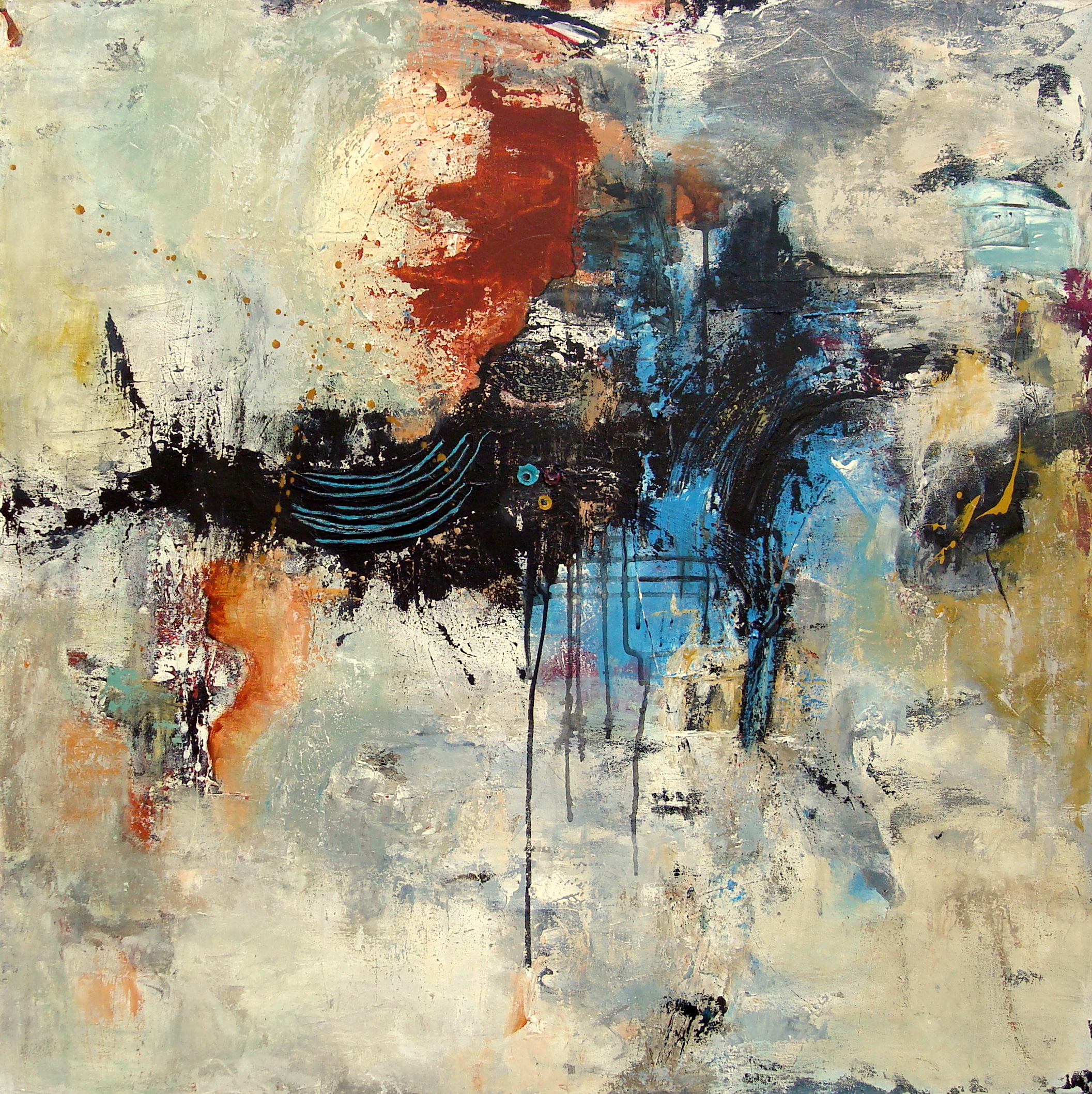 Abstracte schilderijen, met een intens kleurenpalet, waarbij gebruik gemaakt wordt van verschillende materialen en technieken. Vergankelijkheid heeft haar grote passie.