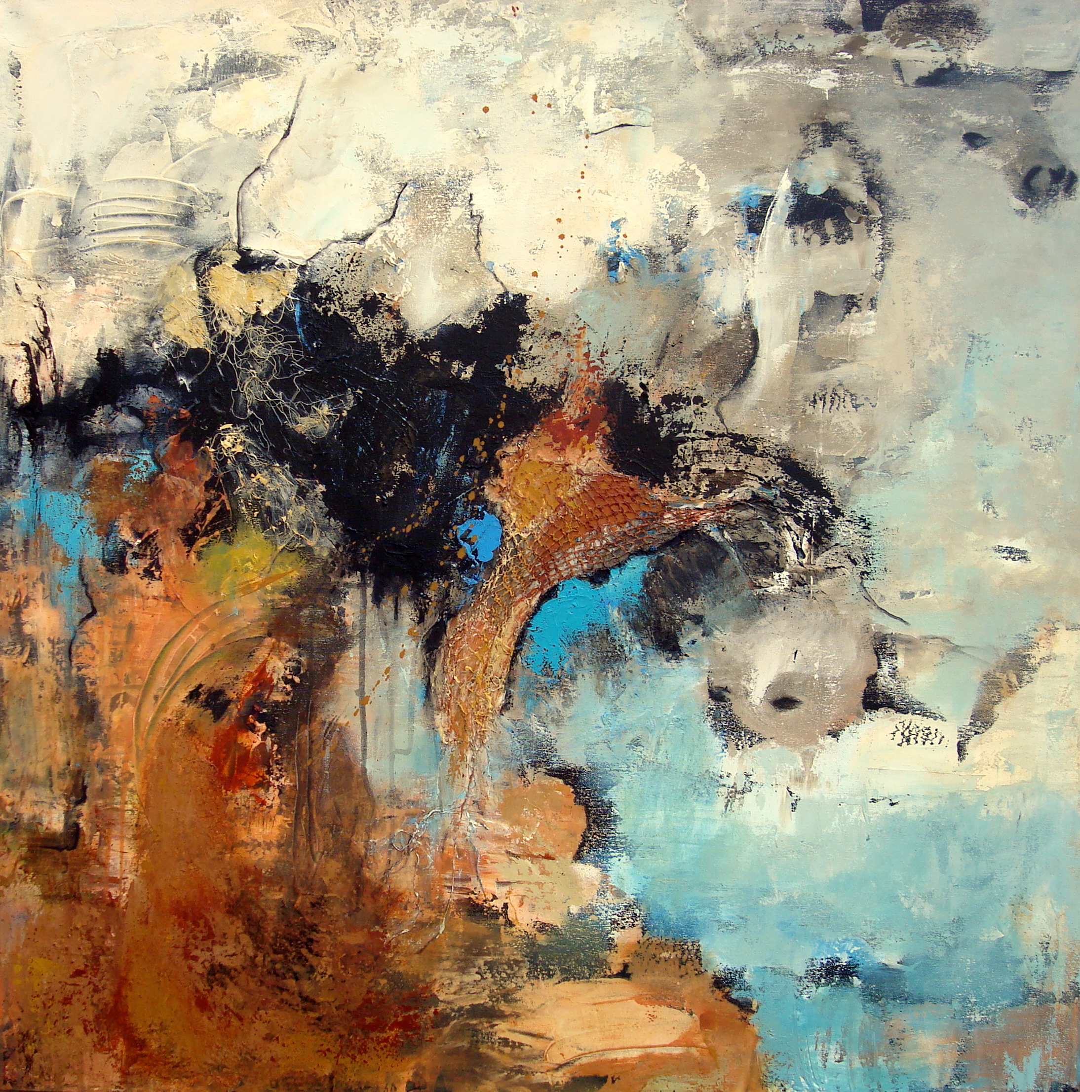 Abstracte schilderijen, met een intens kleurenpalet, waarbij gebruik gemaakt wordt van verschillende materialen en technieken. Vergankelijkheid heeft haar grote passie.