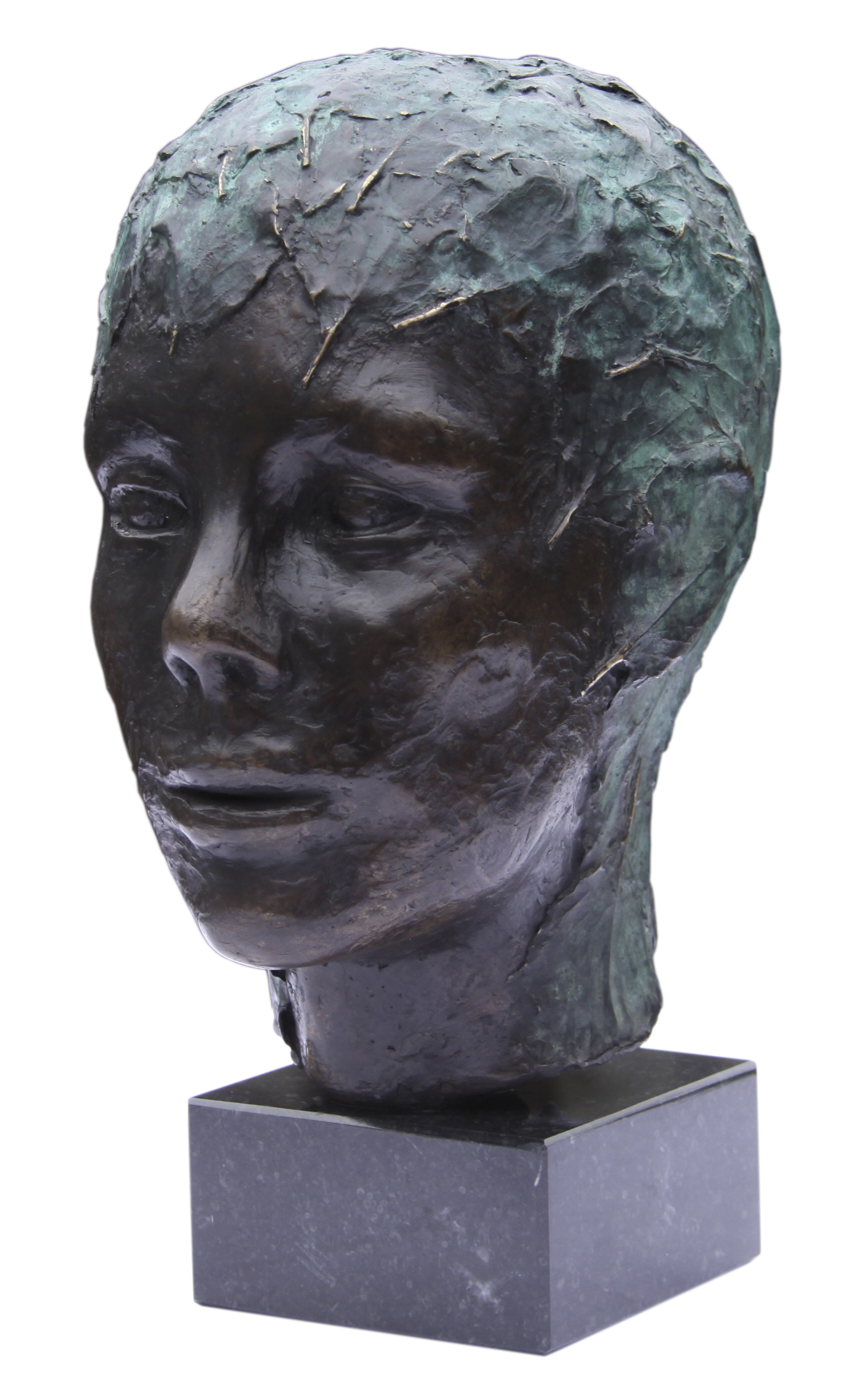 Portret met haren van bladeren.unicum van brons op hardstenen sokkel.