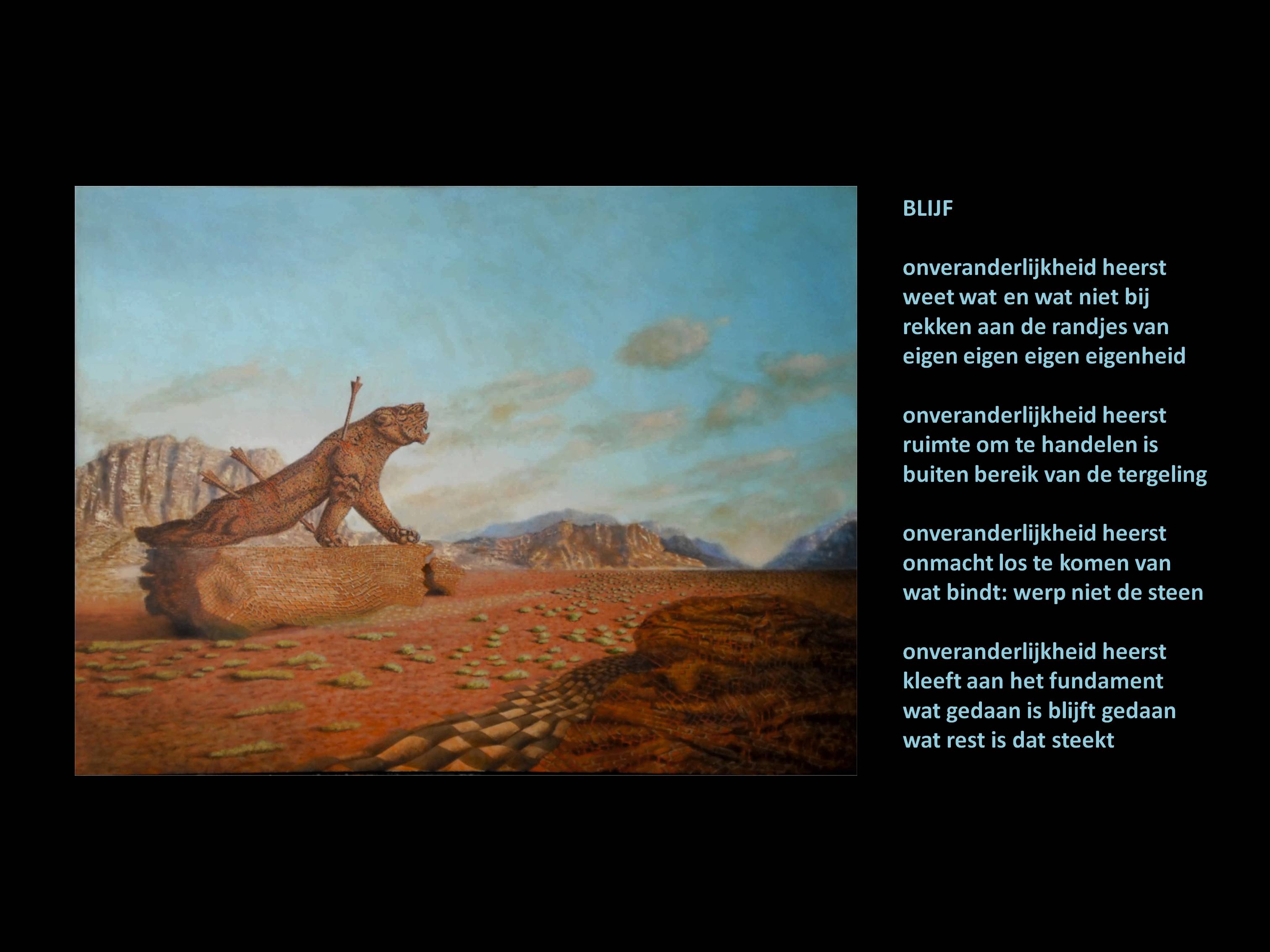 Assyrion Lion - olieverf op paneel, 80x60 cm, 2010 - Araz Talib De schilder Araz Talib vluchtte uit Kirkuk in Irak en heeft jarenlang in Amsterdam gewoond en gewerkt. Hij maakte een serie schilderijen waarbij hij een bestaand beeld of gebouw uit zijn oorspronkelijke omgeving haalde en in een woestijn portretteerde. Het gedicht BLIJF heb ik geschreven bij zijn schilderij Assyrion Lion.