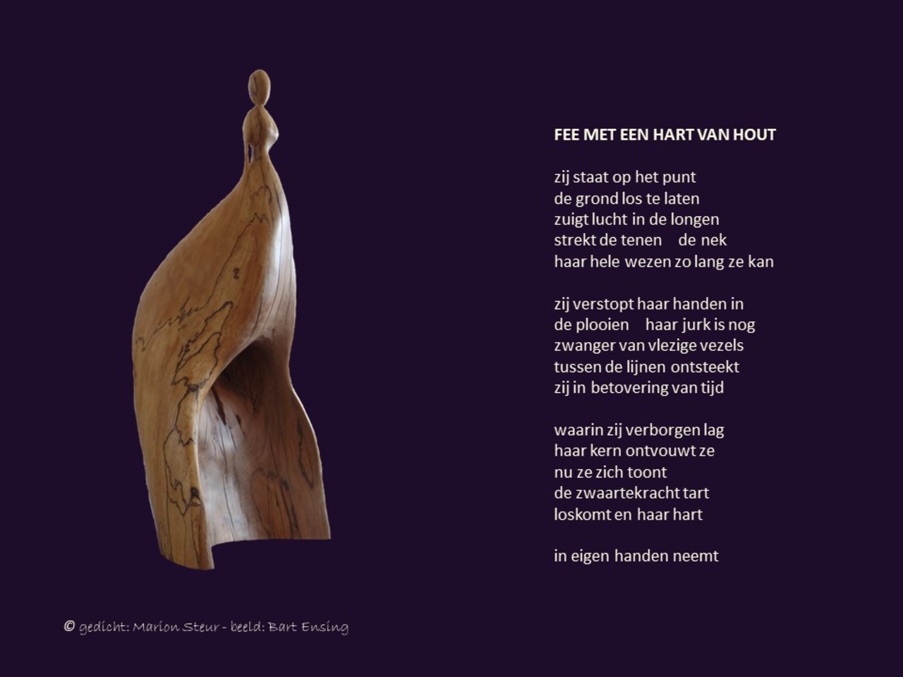 Gedicht van Marion Steur bij houten beeld van Bart Ensing. Opgenomen in de beeld-dichtbundel Voel maar - gesproken hout