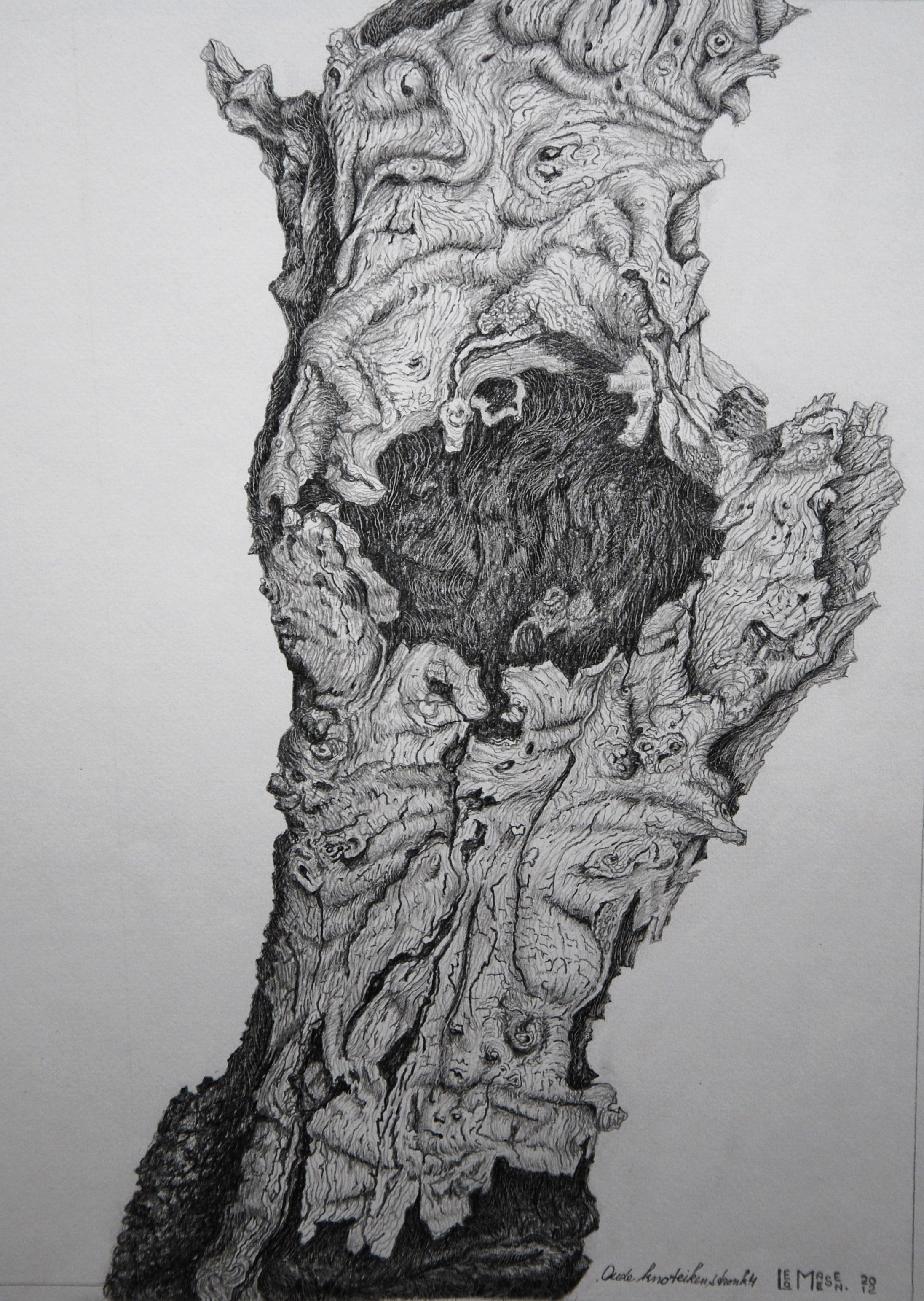 Deze gedeeltelijk verrotte zeer oude knoteikenstronk vond ik tijdens een wandeling . Hij heeft zijn leven geleefd en is vele malen van zijn takken ontdaan tot hij het snoeien niet meer verdragen kon. Nu is hij een dankbaar onderwerp om van alle kanten te tekenen.