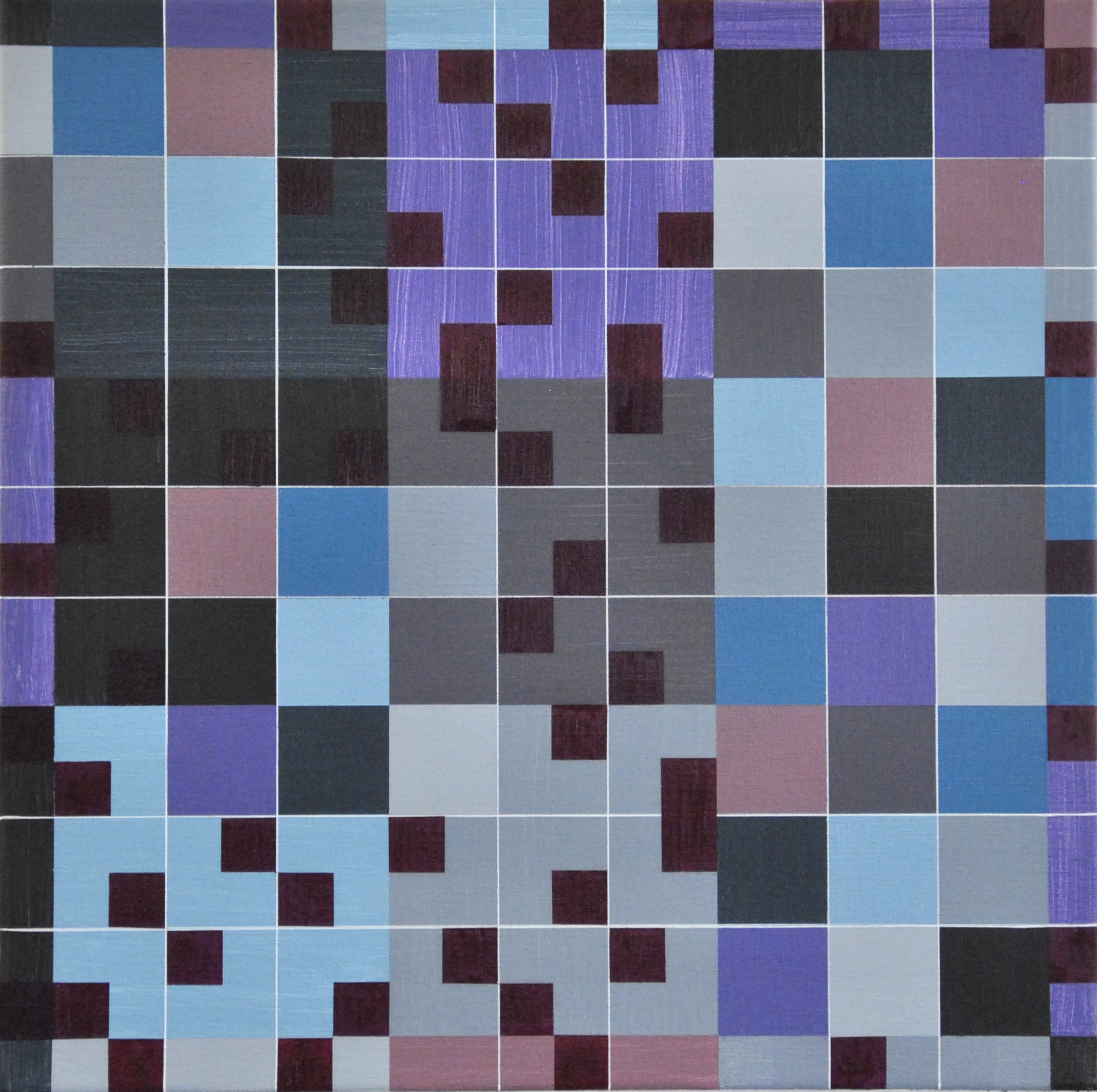 Thema: Chaos (Geometrische Chaos) Mijn kunst is beïnvloedt door de moderne wiskundige en wetenschappelijke benadering van het begrip complexe orde van de natuur. Met name heb ik me verdiept in de Chaos theorie en de fractal geometrie. Ik ben geen wiskundige, en ik gebruik geen wiskundige formules. De ideeën van de Chaos theorie en fractal geometrie leiden tot de ontwikkeling van de composities in mijn werk. Ik gebruik driehoeken,vierkanten en cirkels in mijn schilderijen, maar in mijn huidige serie, geoChao richt ik me alleen op de vierkanten en de verhoudingen tussen de vierkanten. Ik ontwikkel mijn composities door kleine vierkantjes op grote te zetten of grote op kleine te zetten. Het gaat om de onderlinge verhoudingen tussen de vierkanten. Ik laat de methode die ik kies de compositi