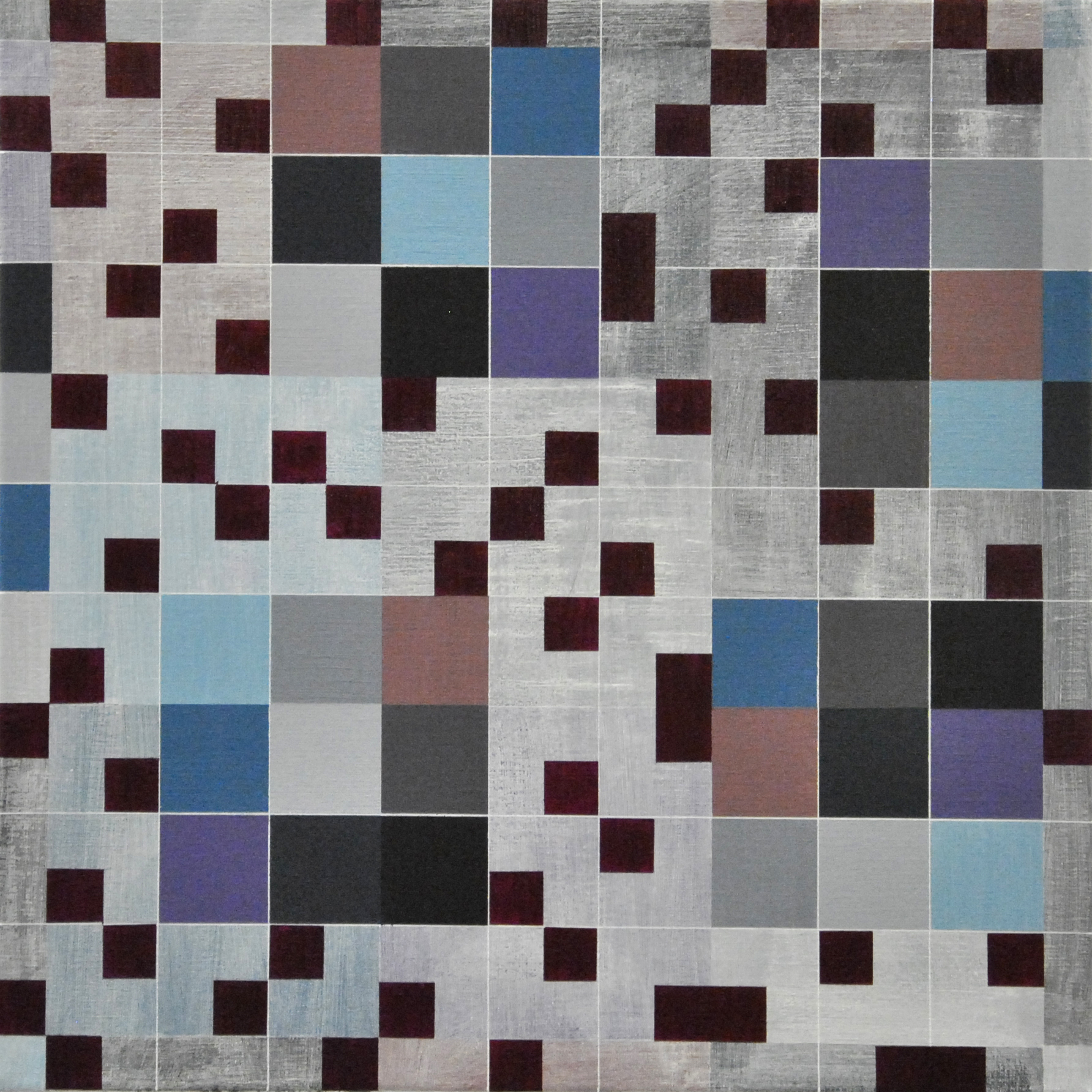 Thema: Chaos (Geometrische Chaos) Mijn kunst is beïnvloedt door de moderne wiskundige en wetenschappelijke benadering van het begrip complexe orde van de natuur. Met name heb ik me verdiept in de Chaos theorie en de fractal geometrie. Ik ben geen wiskundige, en ik gebruik geen wiskundige formules. De ideeën van de Chaos theorie en fractal geometrie leiden tot de ontwikkeling van de composities in mijn werk. Ik gebruik driehoeken,vierkanten en cirkels in mijn schilderijen, maar in mijn huidige serie, geoChao richt ik me alleen op de vierkanten en de verhoudingen tussen de vierkanten. Ik ontwikkel mijn composities door kleine vierkantjes op grote te zetten of grote op kleine te zetten. Het gaat om de onderlinge verhoudingen tussen de vierkanten. Ik laat de methode die ik kies de compositi
