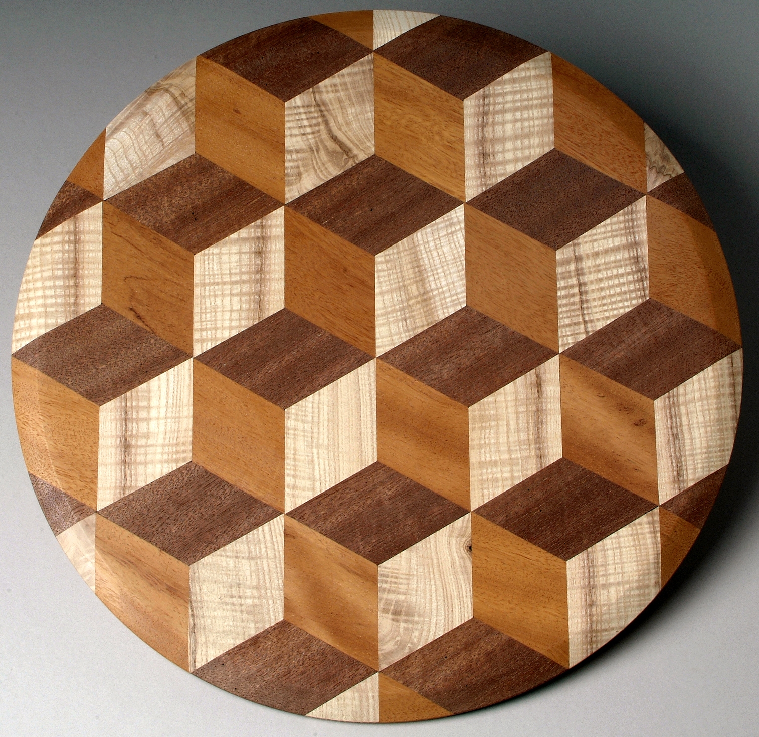 in dit werk zijn 3 houtsoorten verwerkt waarbij de nerf van het hout het eigenlijke effect geeft. op een foto is dat moeilijk te zien, maar in het echt reflecteren de 3 parallellogrammen die samen een kubus maken het licht naar verschillende richtingen. als dit werk tegen de muur hangt en het licht van buiten verandert, zal ook de kleur van het werk enigzins veranderen omdat iedere houtsoort weer anders reageert op verandering van licht. komt het best tot zijn recht tegen de muur als het licht van opzij komt
