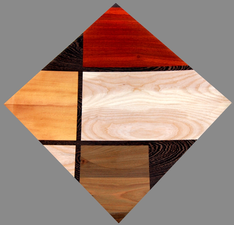 de continenten, het rode, het zwarte, het gele, het bruine en het witte. het werk is een ruit, van punt tot punt gemeten 68cm, de rechte zijden zijn 48cm het rode vlak is padouk, het gele vlak is bilinga, het witte vlak is esdoorn, het groenig/bruine vlak is surinaams groenhart en de zwarte belijning is wengé