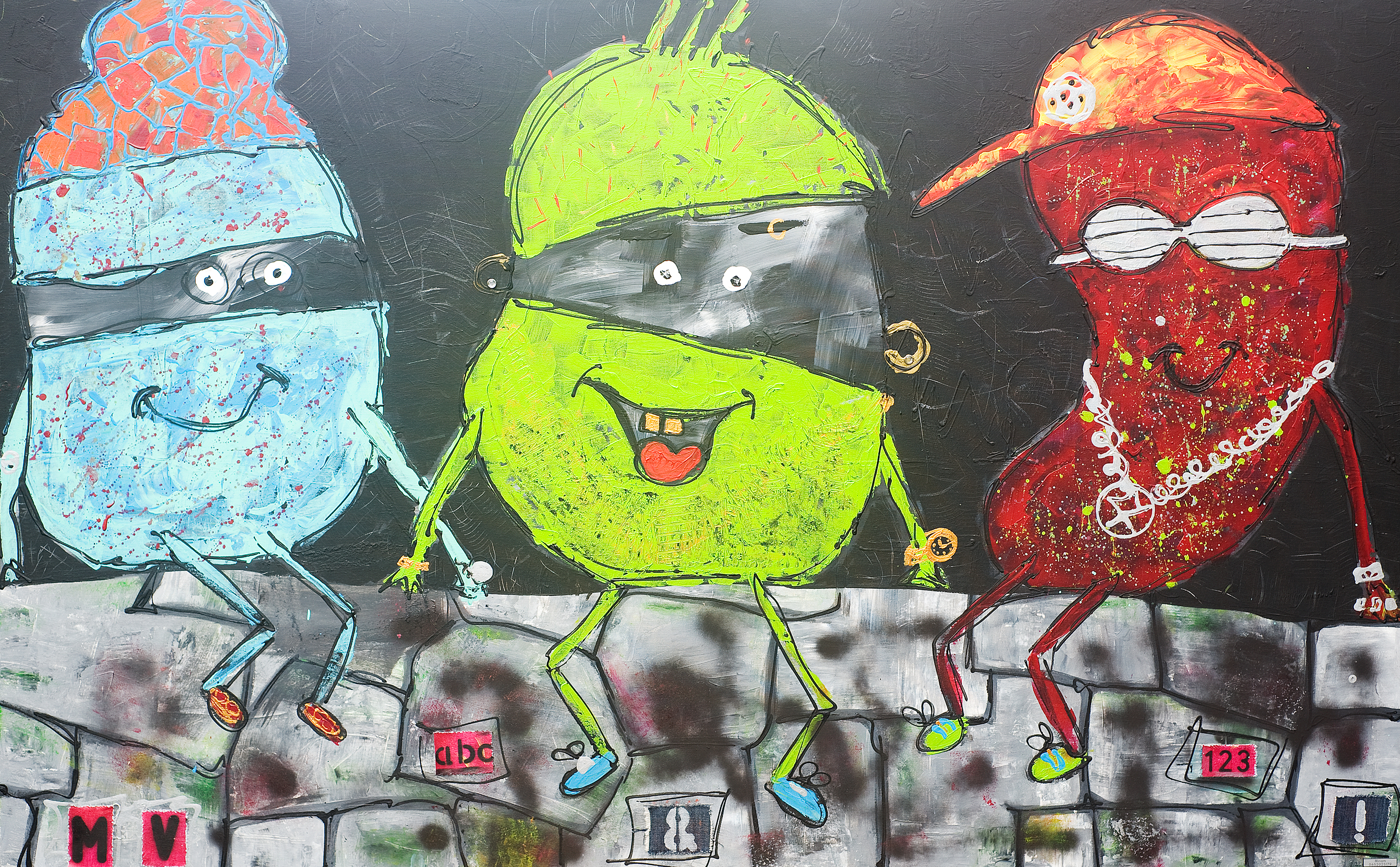 Schilderij van 3 jongens figuren op een muurtje. Geinspireerd door Ben Saunders, toen nog met gouden tanden!