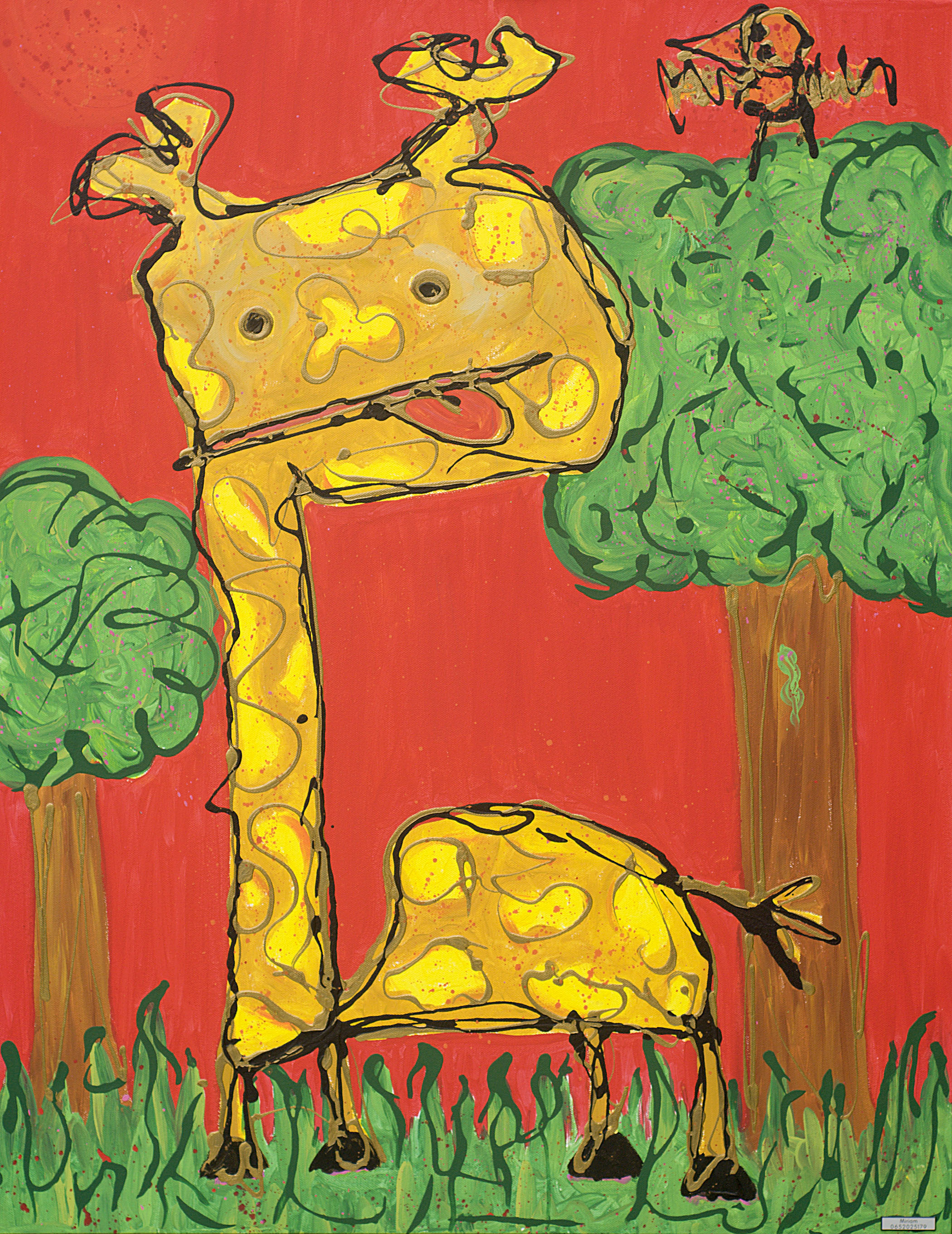 Schilderij van een giraffe die het naar zijn zin heeft.