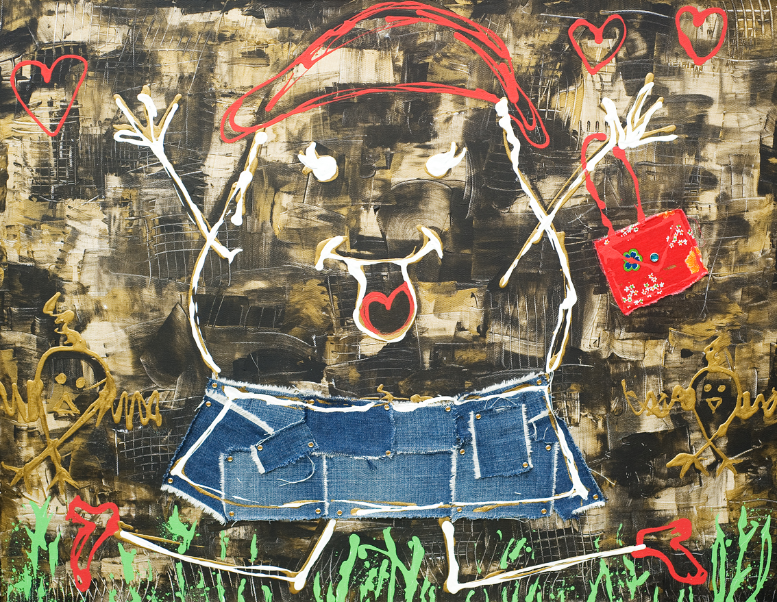 Een schilderij van een vrouw persoon die blij is dat het lente is! Onderdeel van 4 luik 'Four jeansseasons'