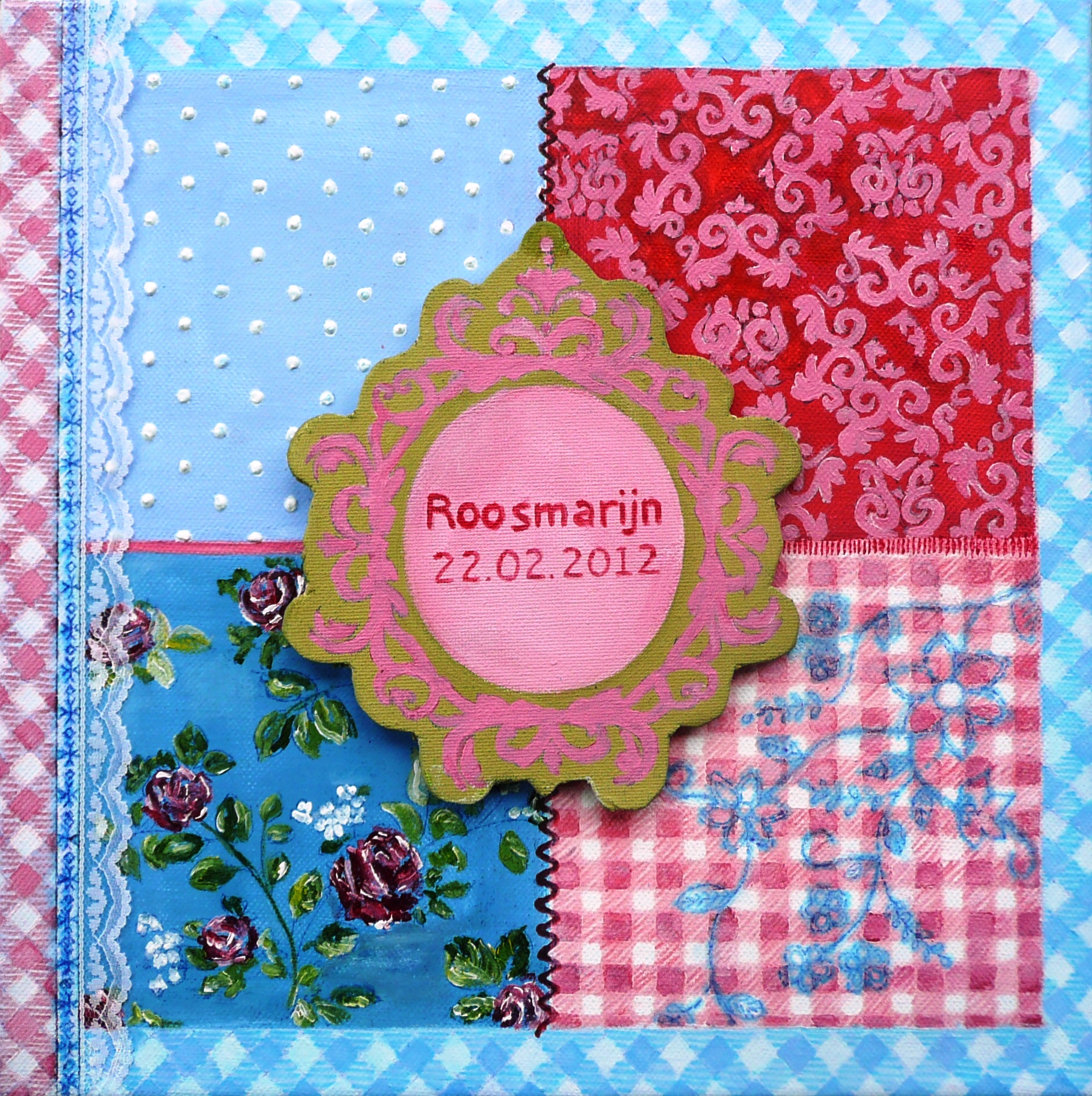 Geboorteschilderij in opdracht n.a.v. een geboortekaartje. Verschillende schildertechnieken gebruikt en echt kant toegevoegd.