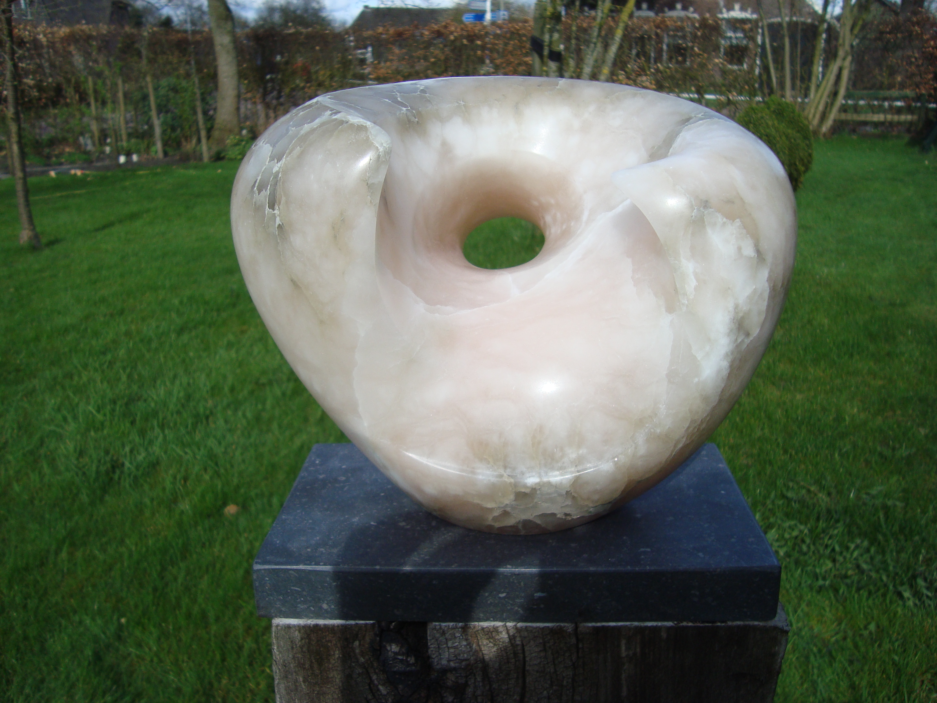 Een prachtig zacht beeld uit een warme honingalbast. De ronde vrouwelijke vorm doet denken aan een baarmoeder, een plek waar je je vertrouwd en geborgen voelt . De sokkel is van Belgisch hardsteen.