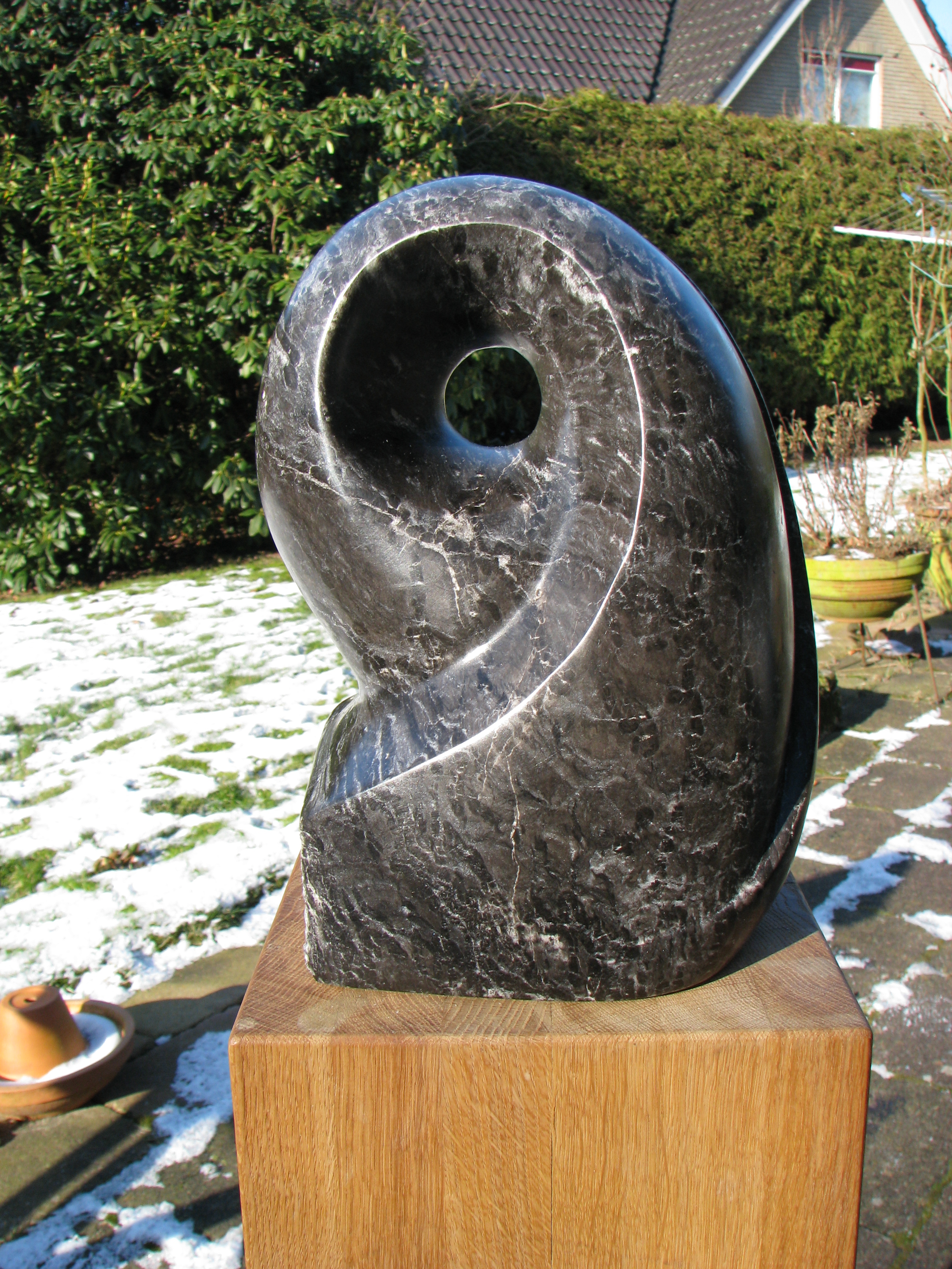 Een beeld in zwarte albast, in opdracht gemaakt, met als inspiratie het gegeven 'dualiteit', uitgewerkt als recht / rond, binnen / buiten, en ruw / glad.